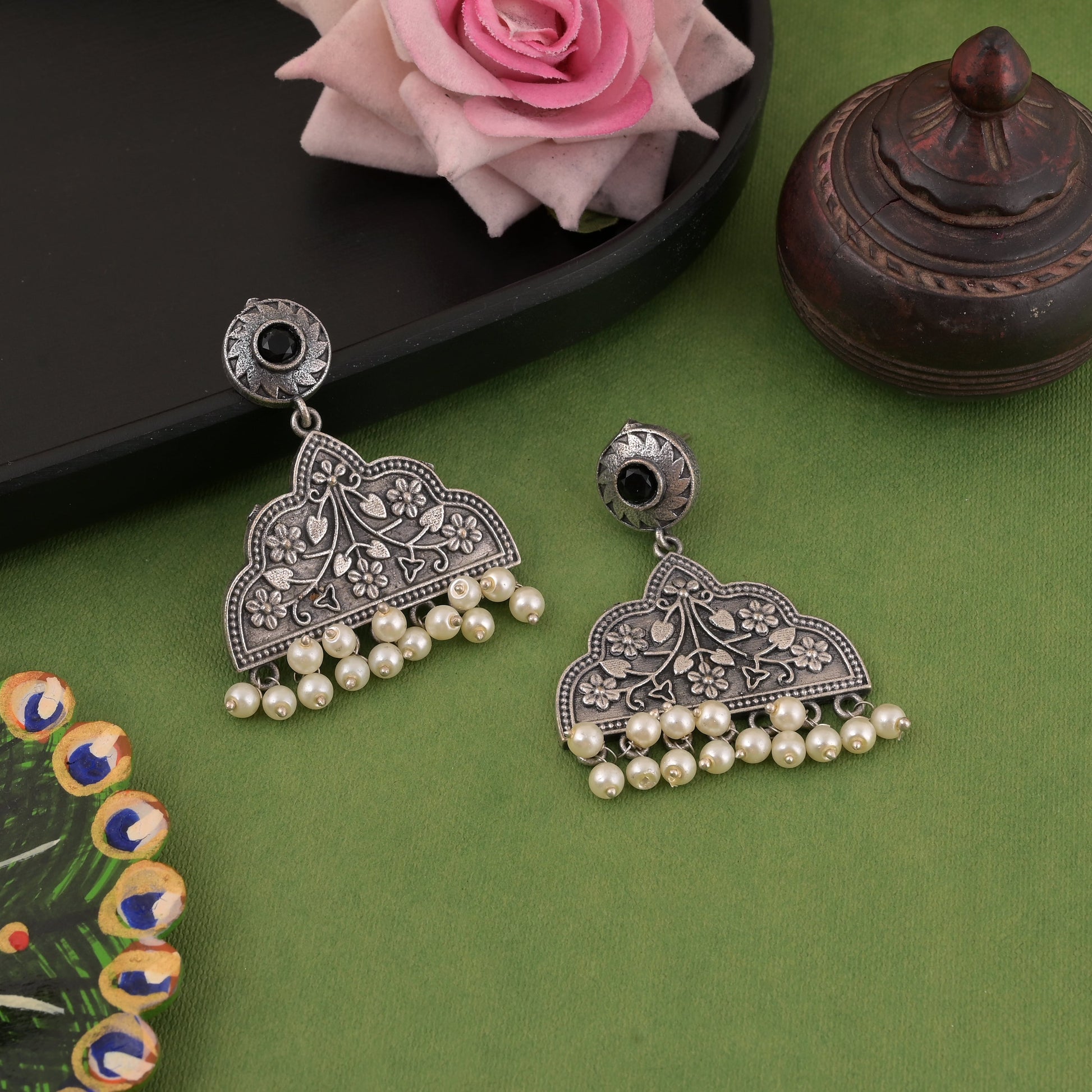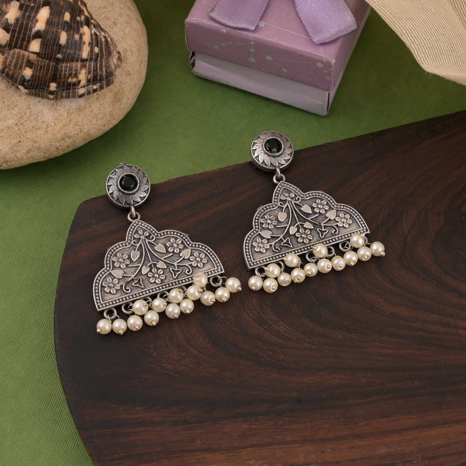 Handgefertigte, schwarz oxidierte Ohrringe mit Verzierungen mit ethnischen Motiven