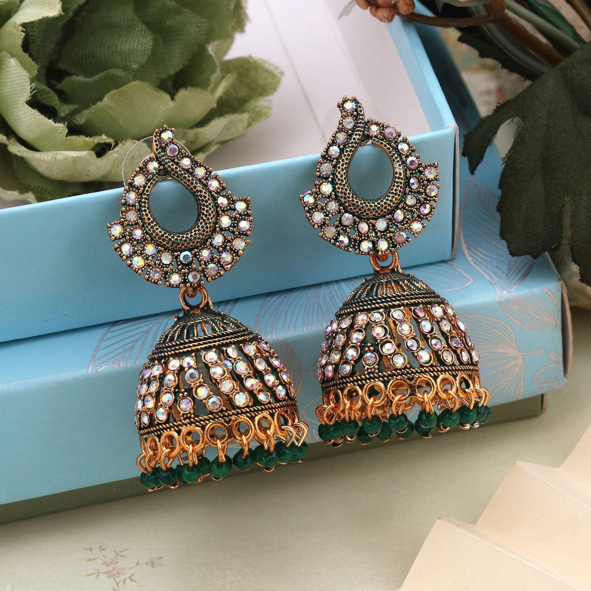 Stilvolle grün-mintfarbene oxidierte Meena-Ohrringe in Handarbeit für Hochzeiten und Party-Looks