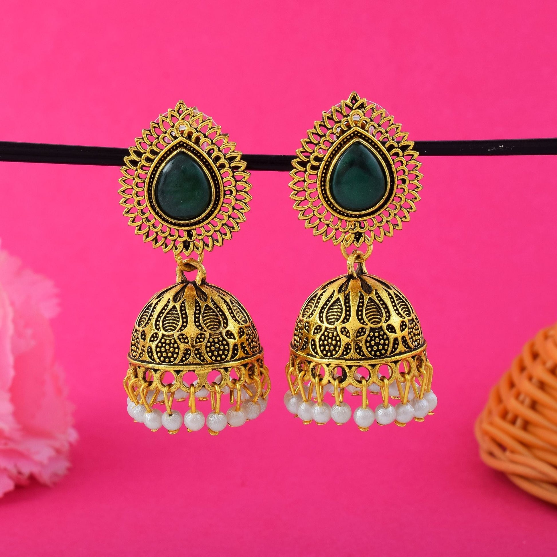 Stilvolle, grün oxidierte Ohrringe, entworfen mit handgefertigter künstlerischer Arbeit für Hochzeitsschmuck für Frauen