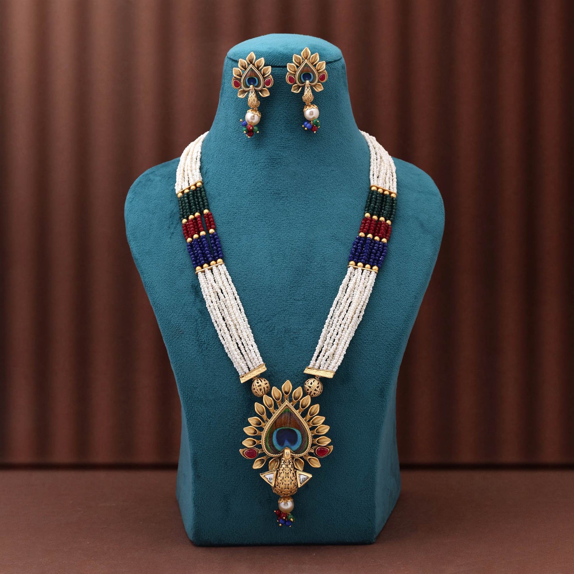Elegant Multi Color Peacock Feather Inspired Designer Matte Gold Necklace Set For Weddings