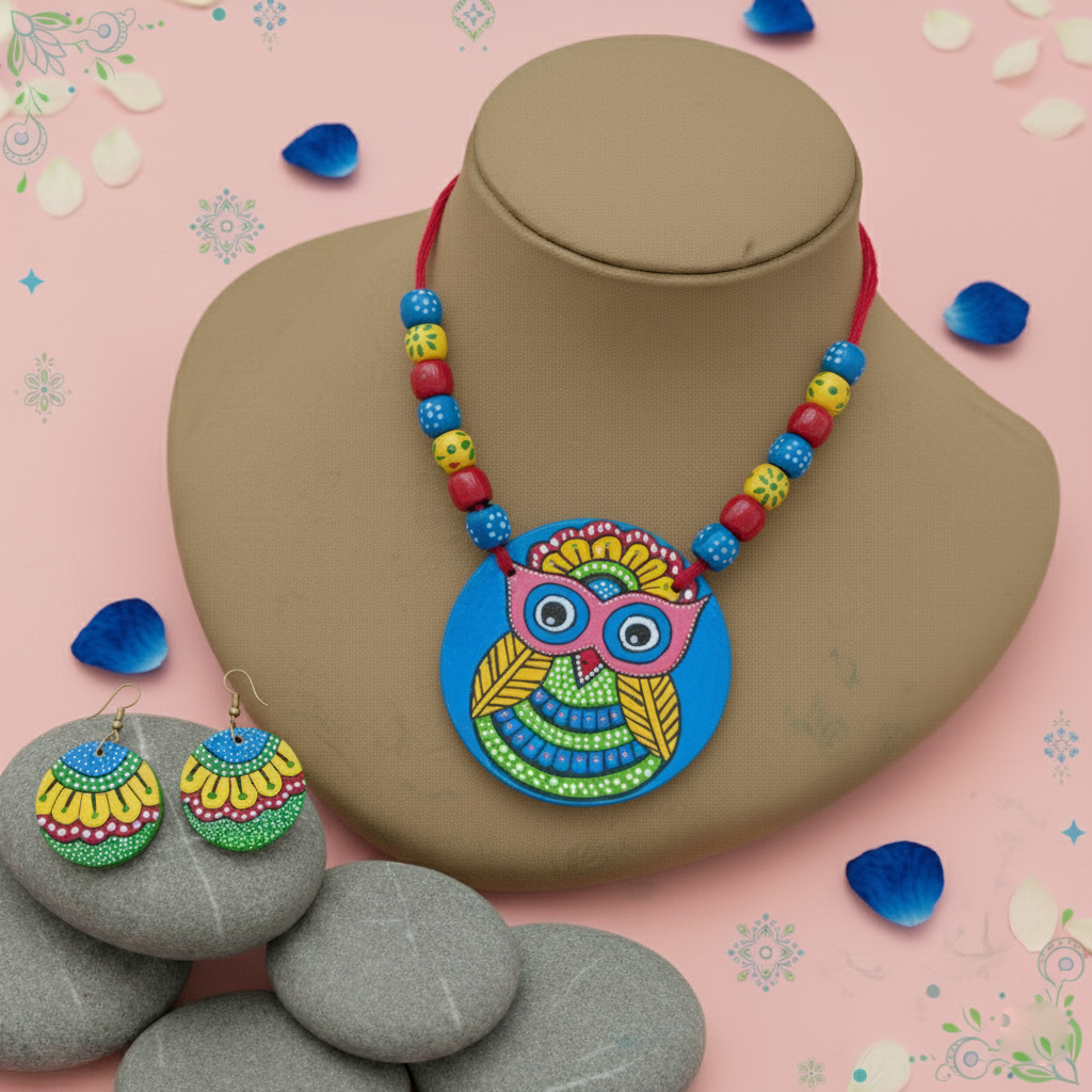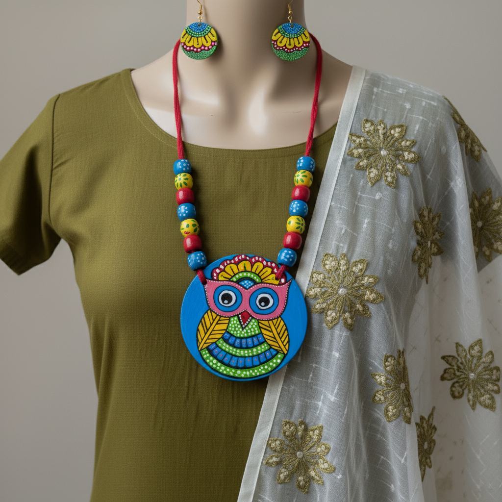 Handgemachtes mehrfarbiges Halsketten-Set aus Holz mit ethnischem Perlenanhänger