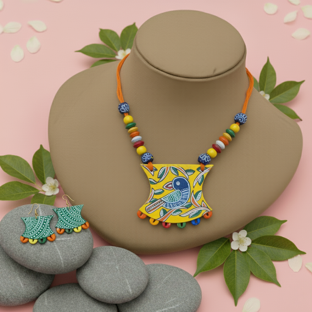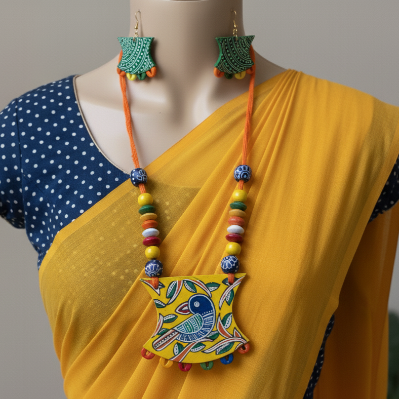 Lebendiges mehrfarbiges handgefertigtes Halsketten-Set aus Holz für zeitgenössische kulturelle Kleidung