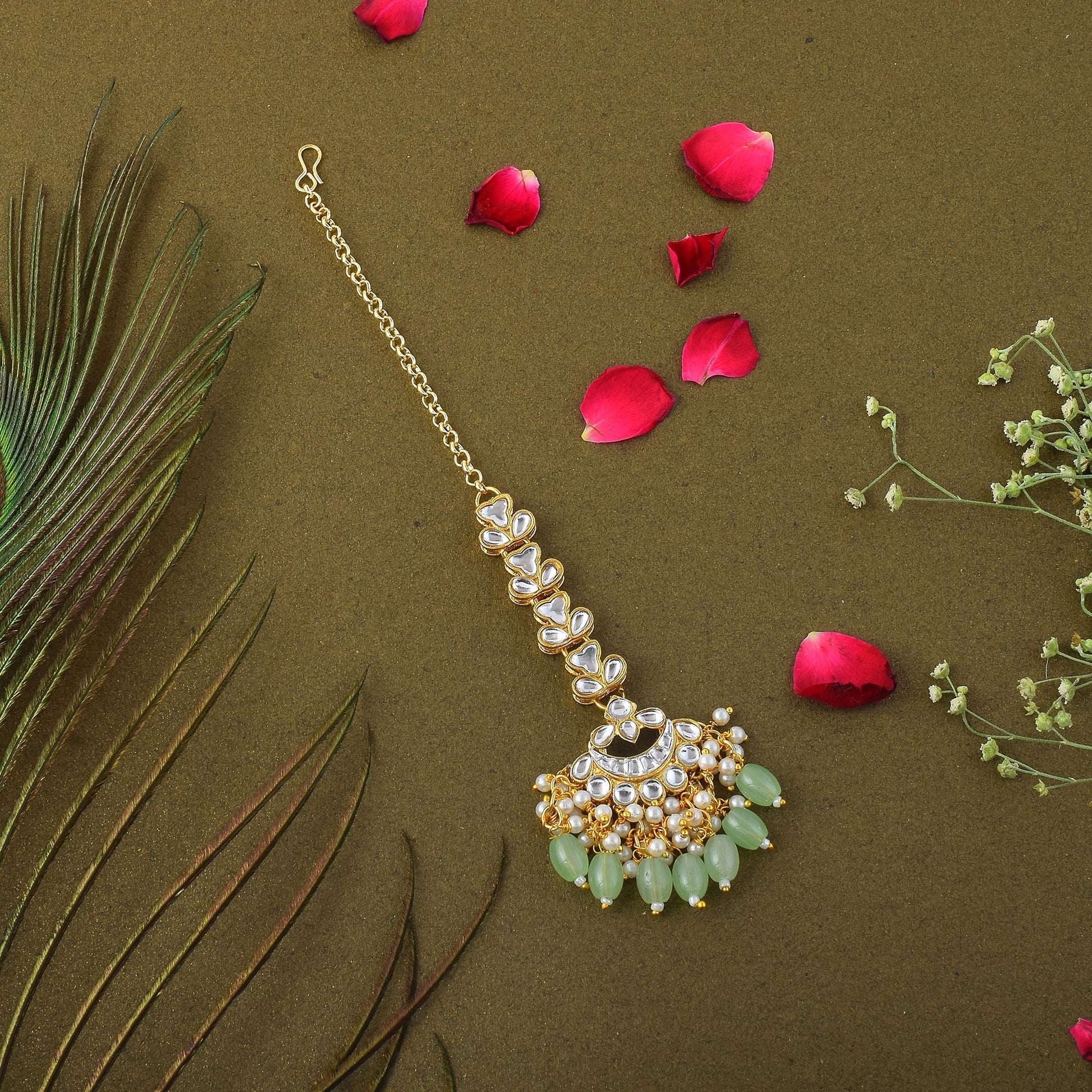Stilvolles Kundan Maang Tikka in Pista-Grün, gefertigt für Bräute, Festivals und kulturelle Veranstaltungen