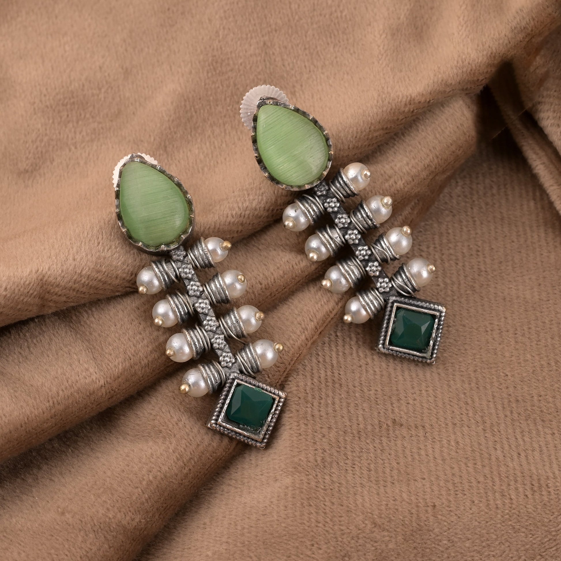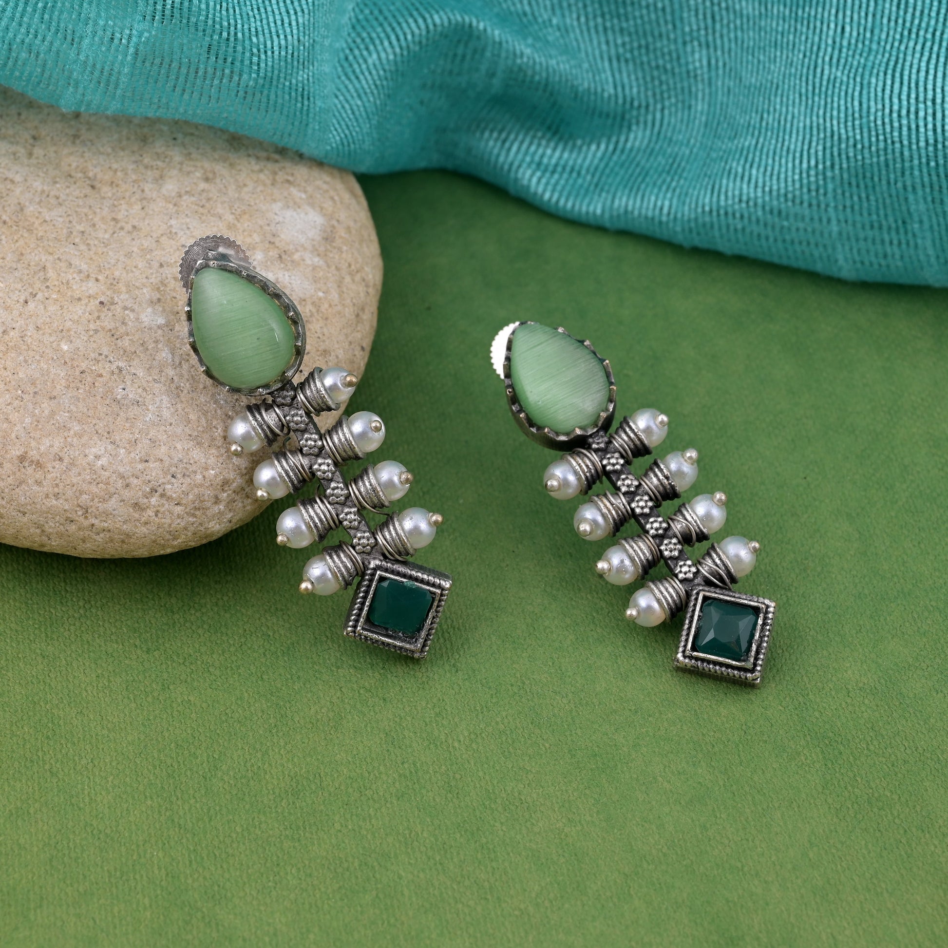 Oxidierte Ohrringe in Pista-Grün mit zarter filigraner und strukturierter Oberfläche