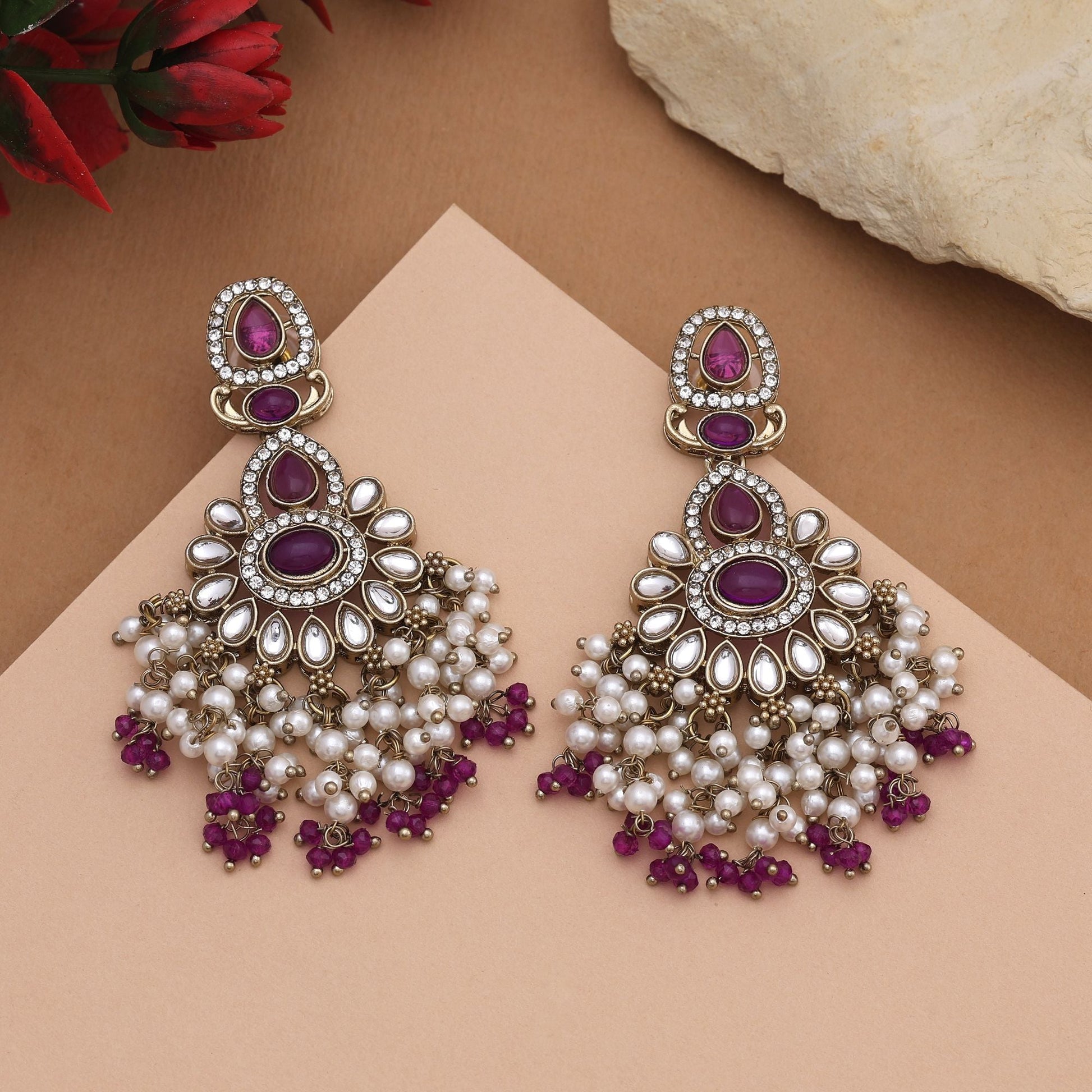 Stilvolle Kundan-Ohrringe in Lila mit Antik-Politur, perfekt für Brautjungfern