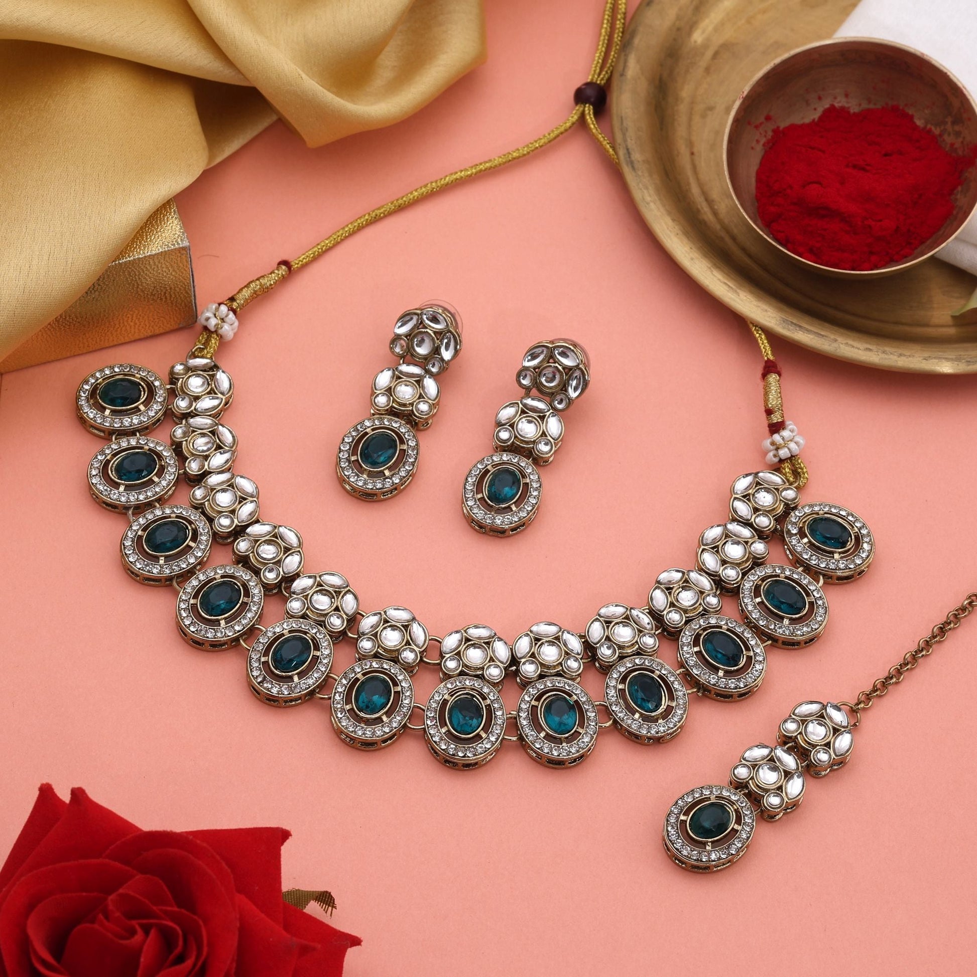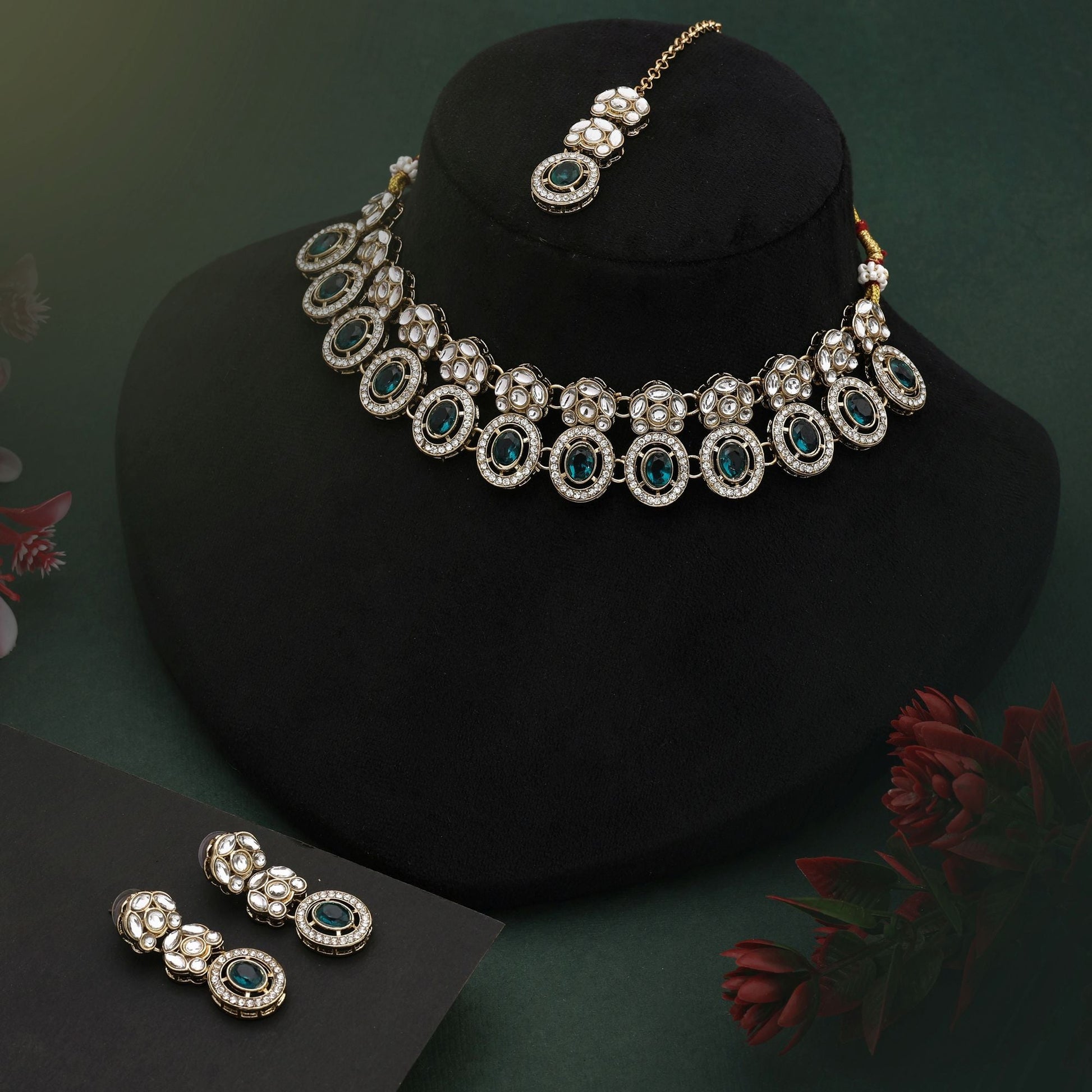 Stilvolles Kundan-Halskettenset in Rama-Grün, perfekt für festliche Anlässe