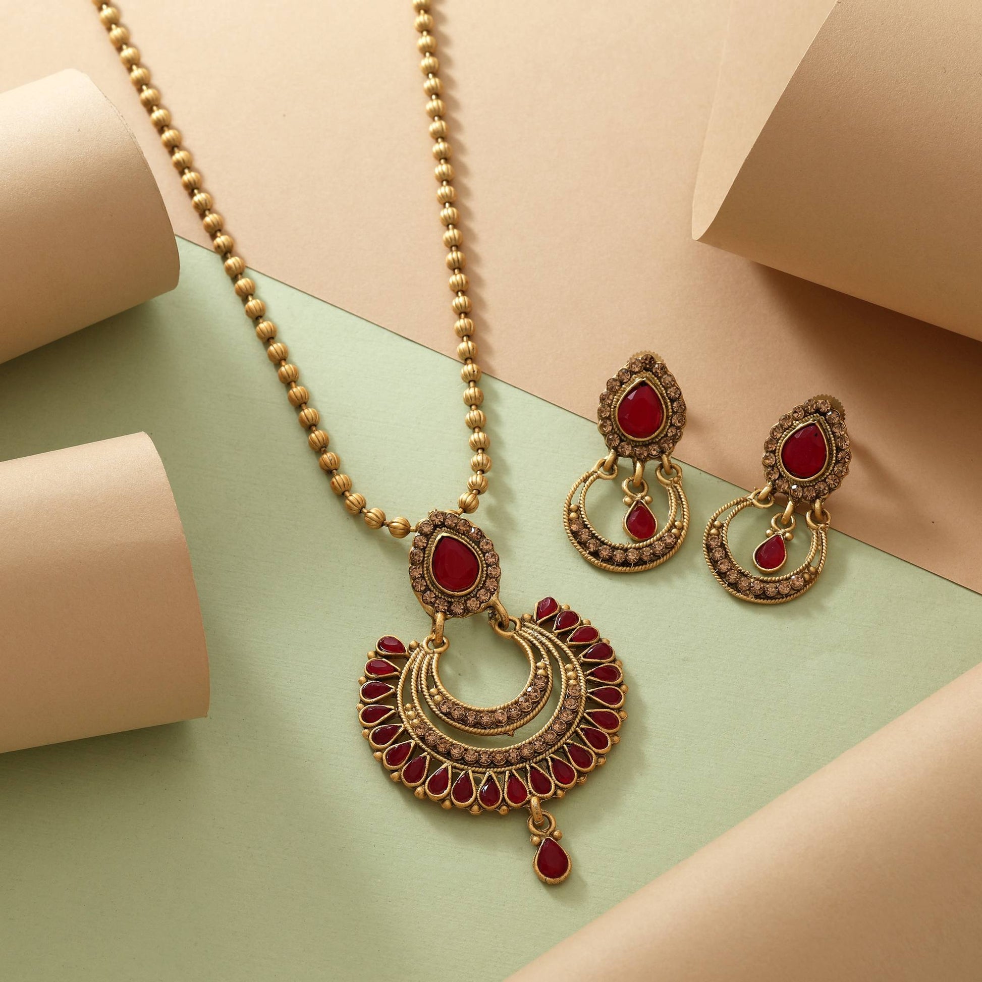 Traditional Rani Color Matte Gold Necklace Set Designed For Elegant Festivities