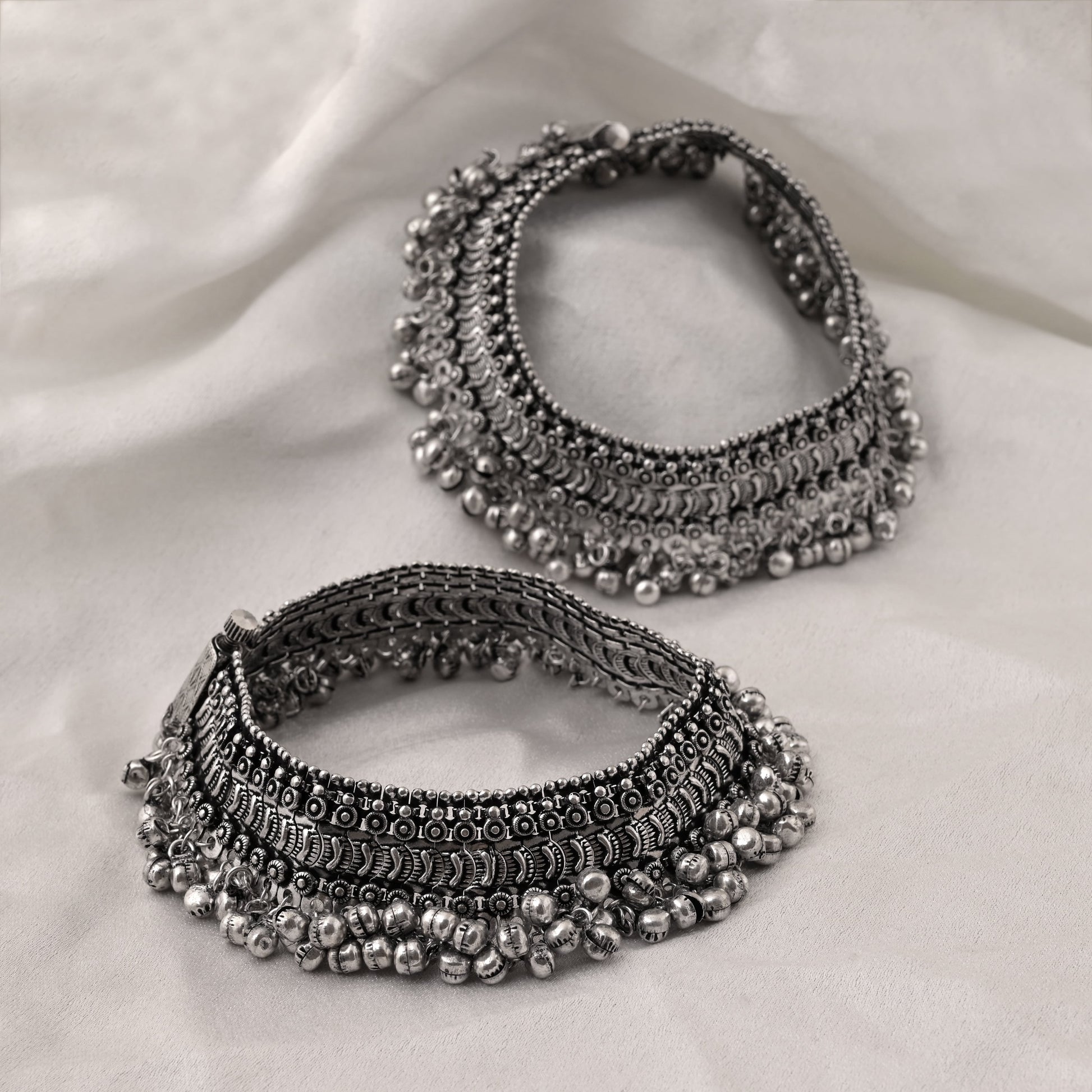 Klassisches, silberfarbenes, oxidiertes Fußkettchen mit zarten Details und traditionellem Finish