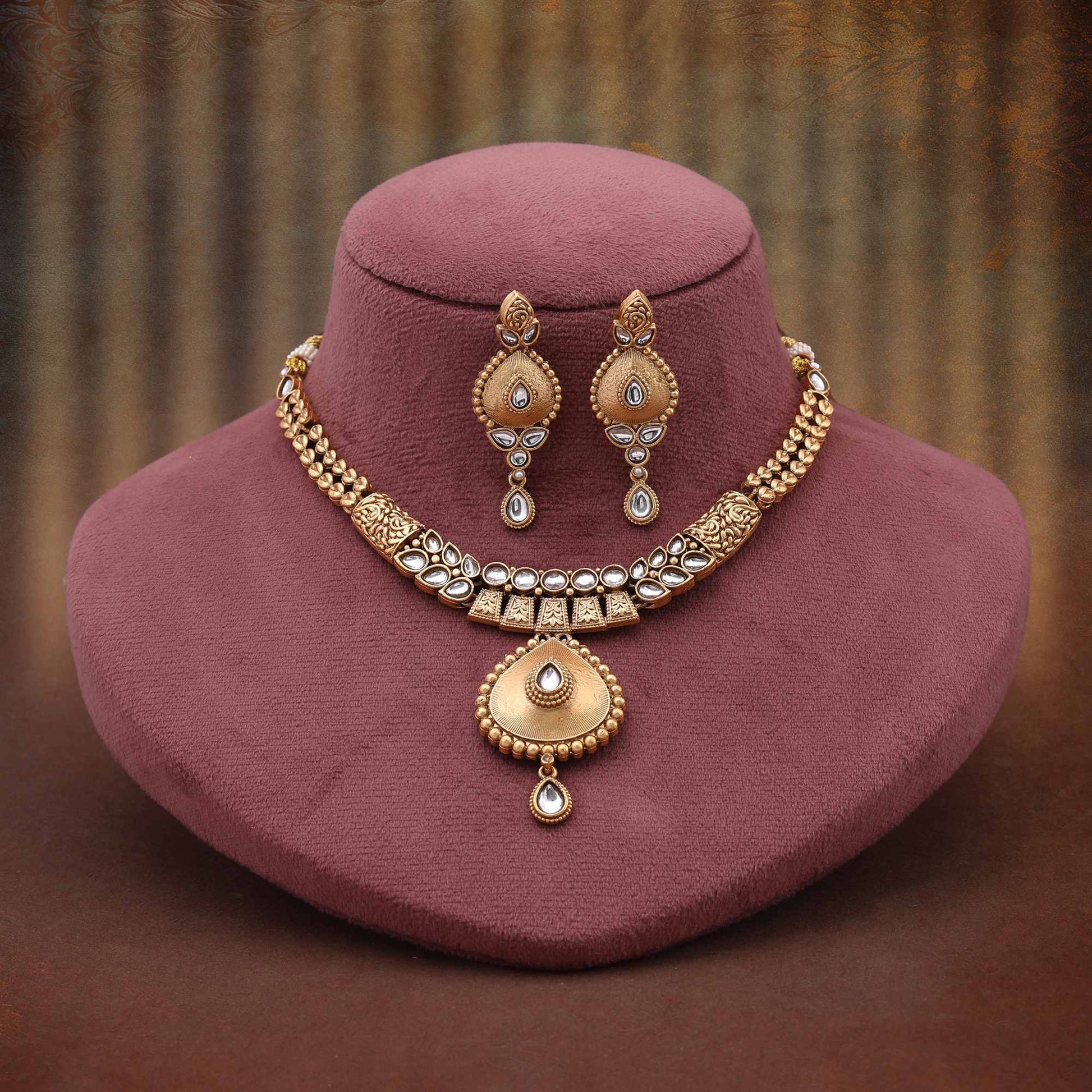Stunning White Color Matte Gold Necklace Set Accented With Crystal Adornments