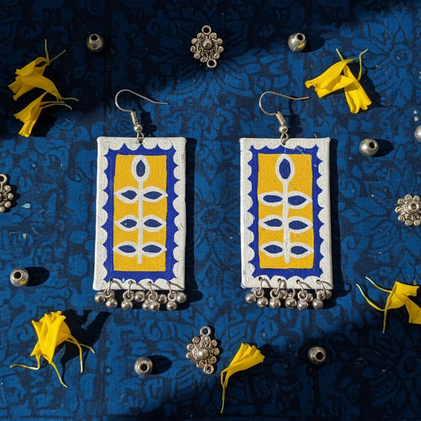 Gelbe und blaue handgefertigte Ohrringe aus Holz mit lebendigem künstlerischem Look