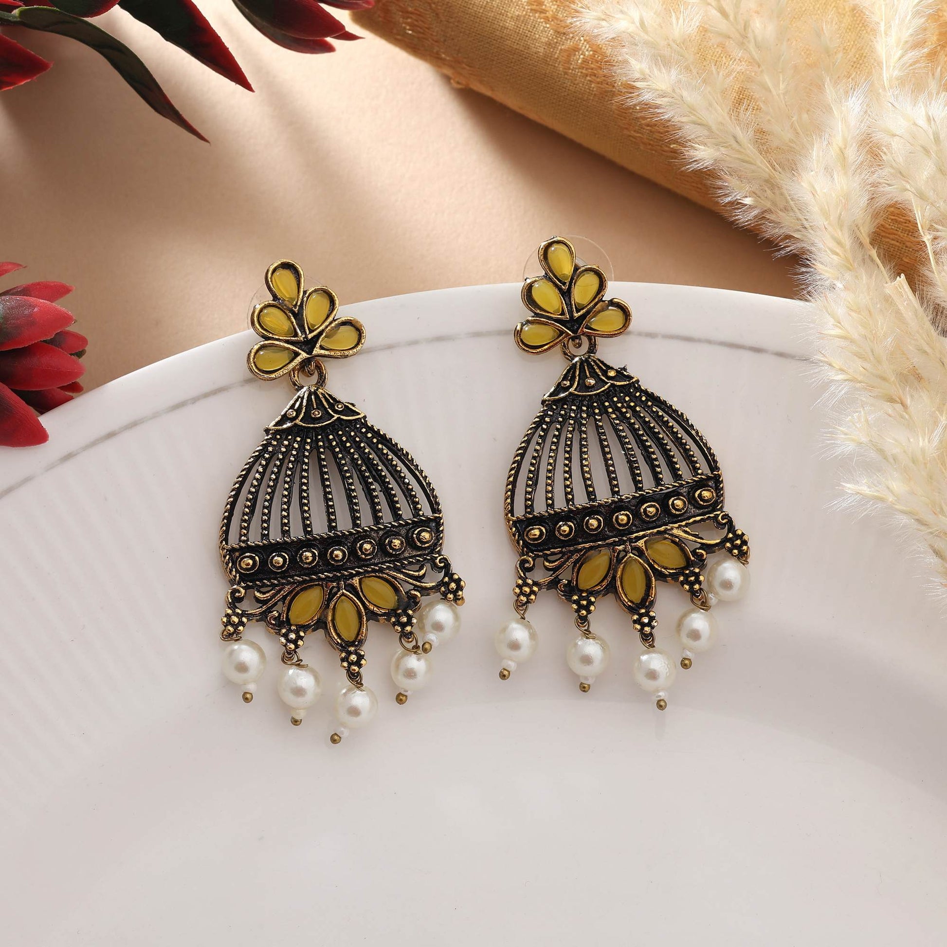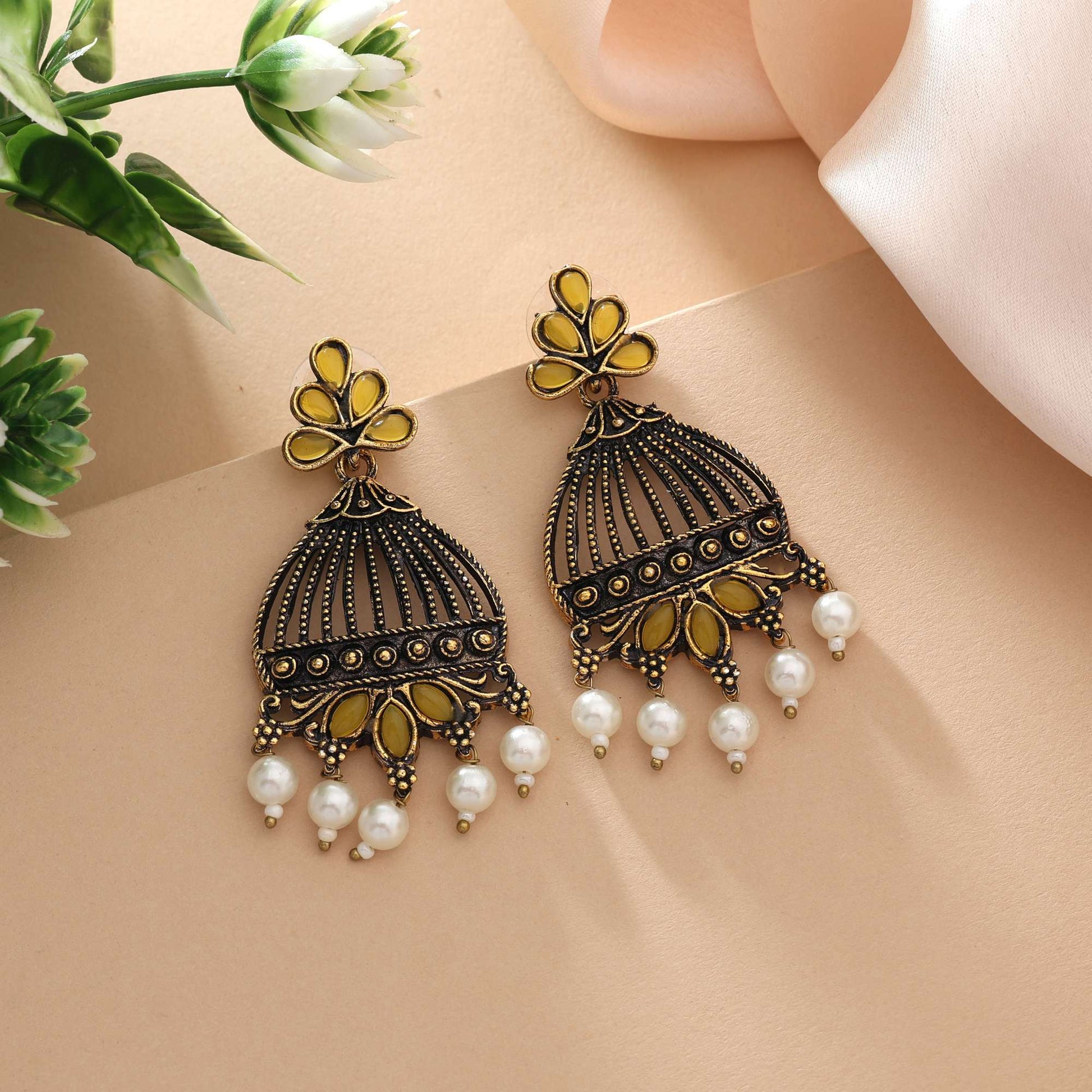 Gelb oxidierte Ohrringe mit leichtem Design und künstlerischer Silberverzierung