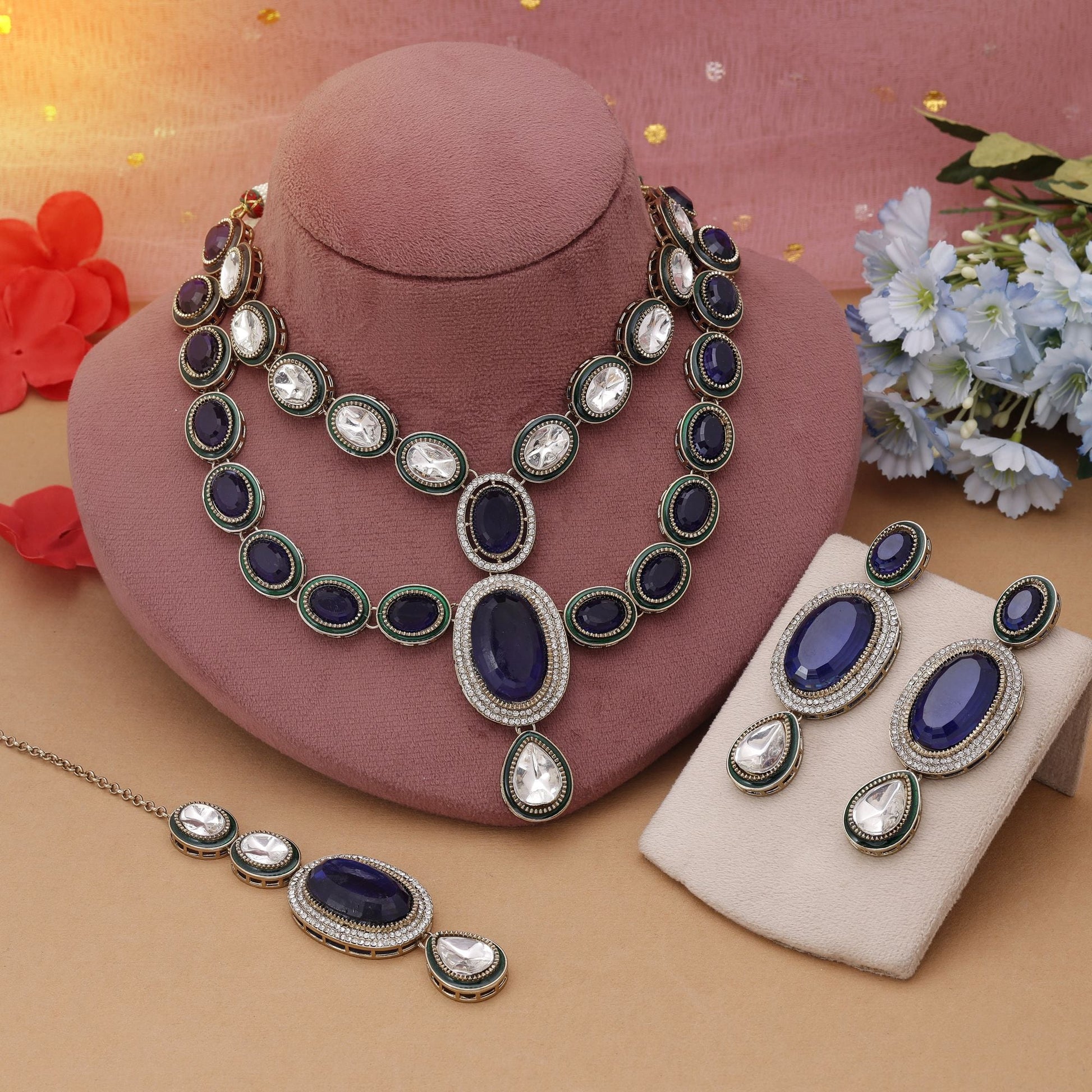 Blue Color Kundan Necklace Set With Elegant Festive Traditional Appeal