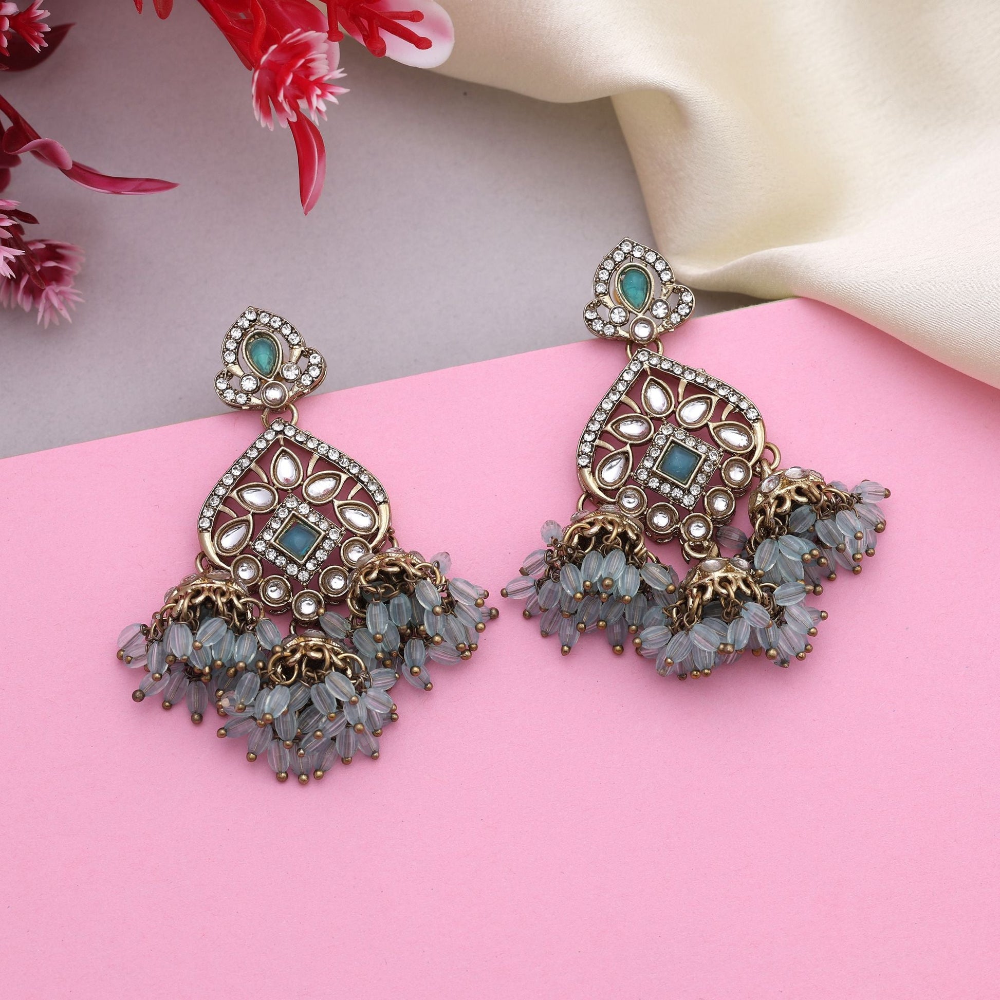 Beautiful Firozi Color Kundan Earrings With Sparkling Stones Perfect For Bridal Wear