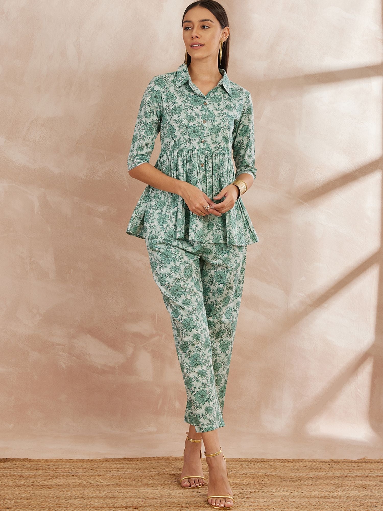 Green Color Floral Printed Pure Cotton Tunic With Trouser