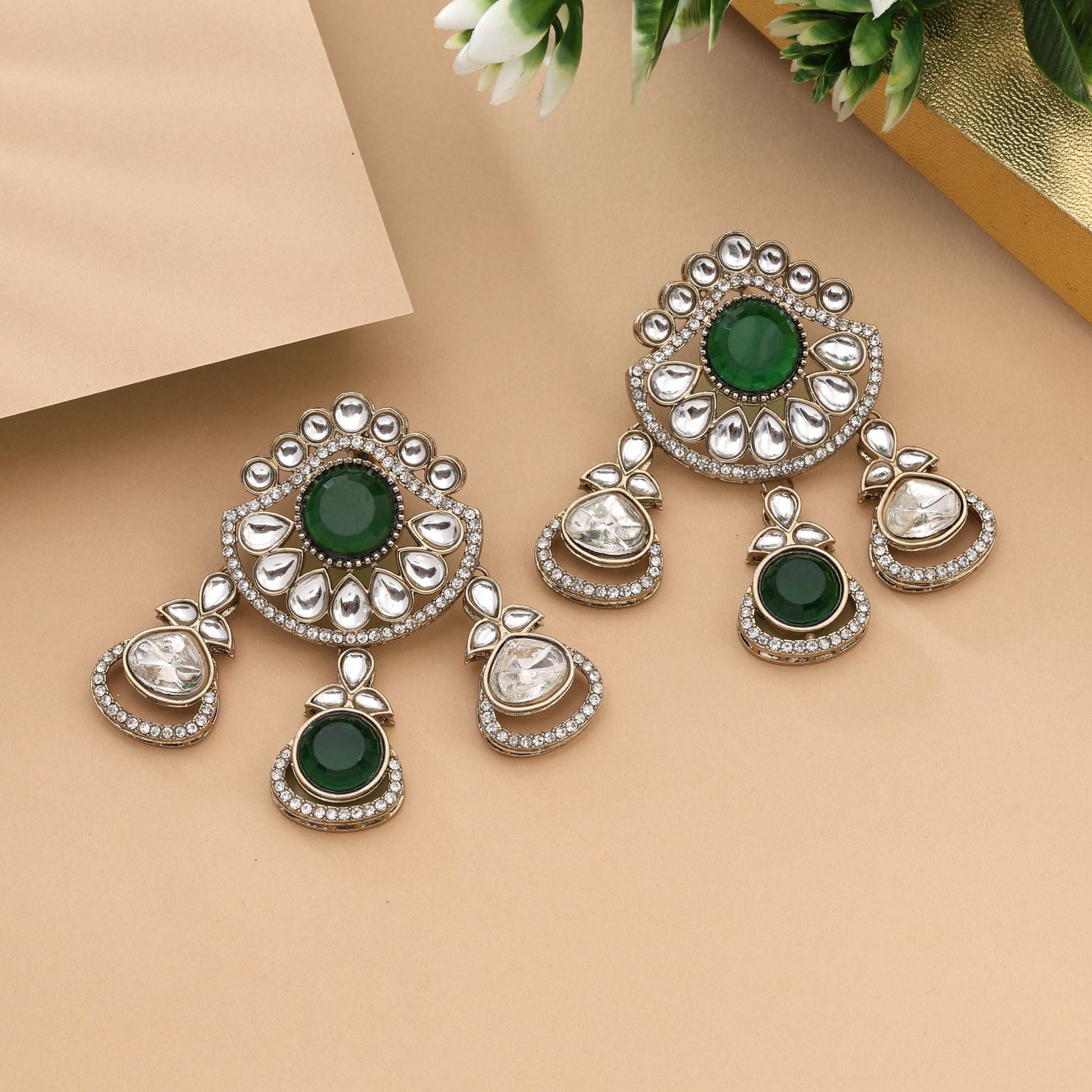 Radiant Green Color Kundan Earrings With Beautiful Polki Stone Detailing