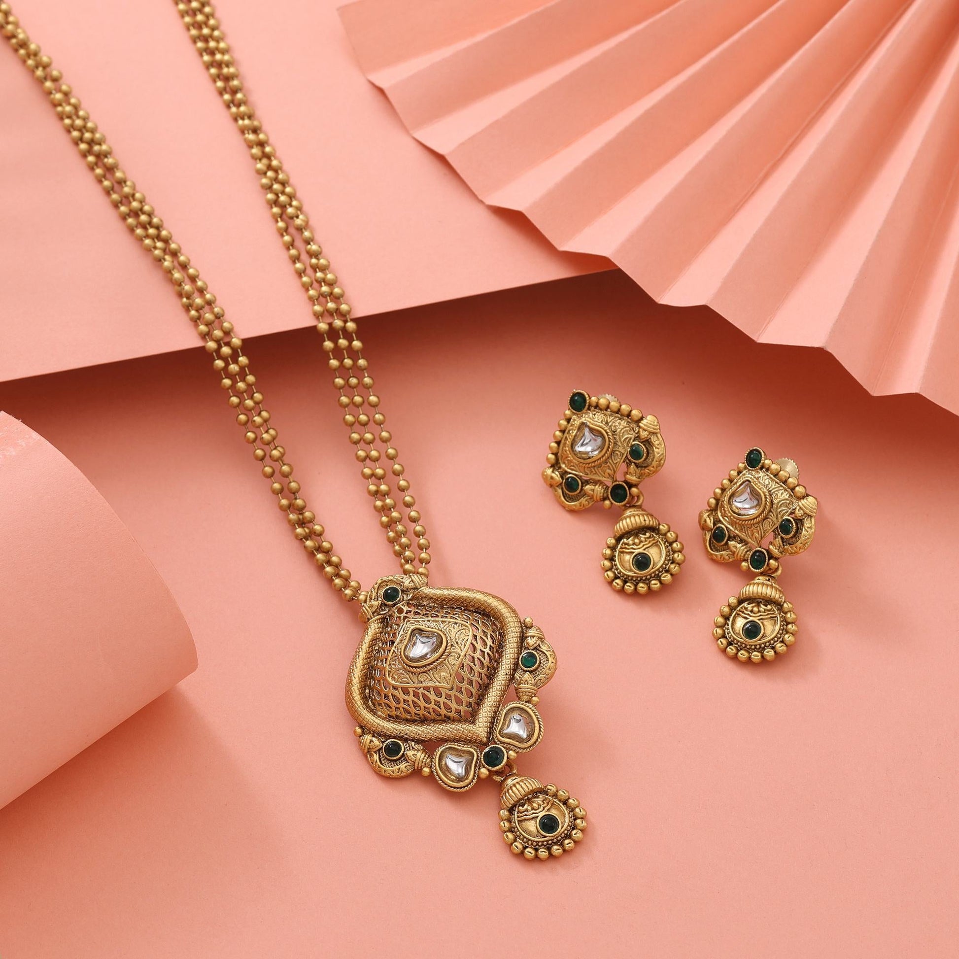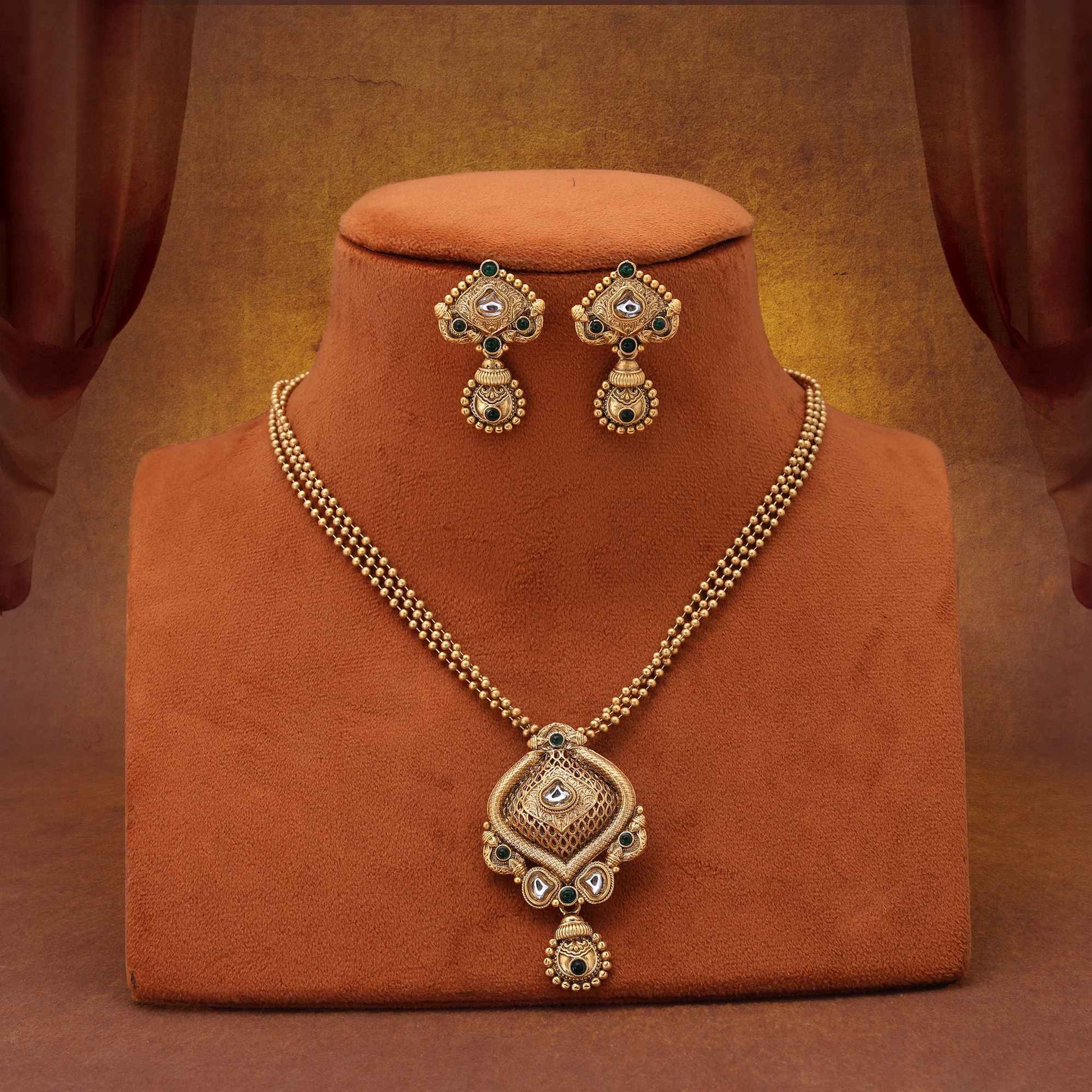 Classic Green Color Antique Polish Matte Gold Necklace Set For Party Wear