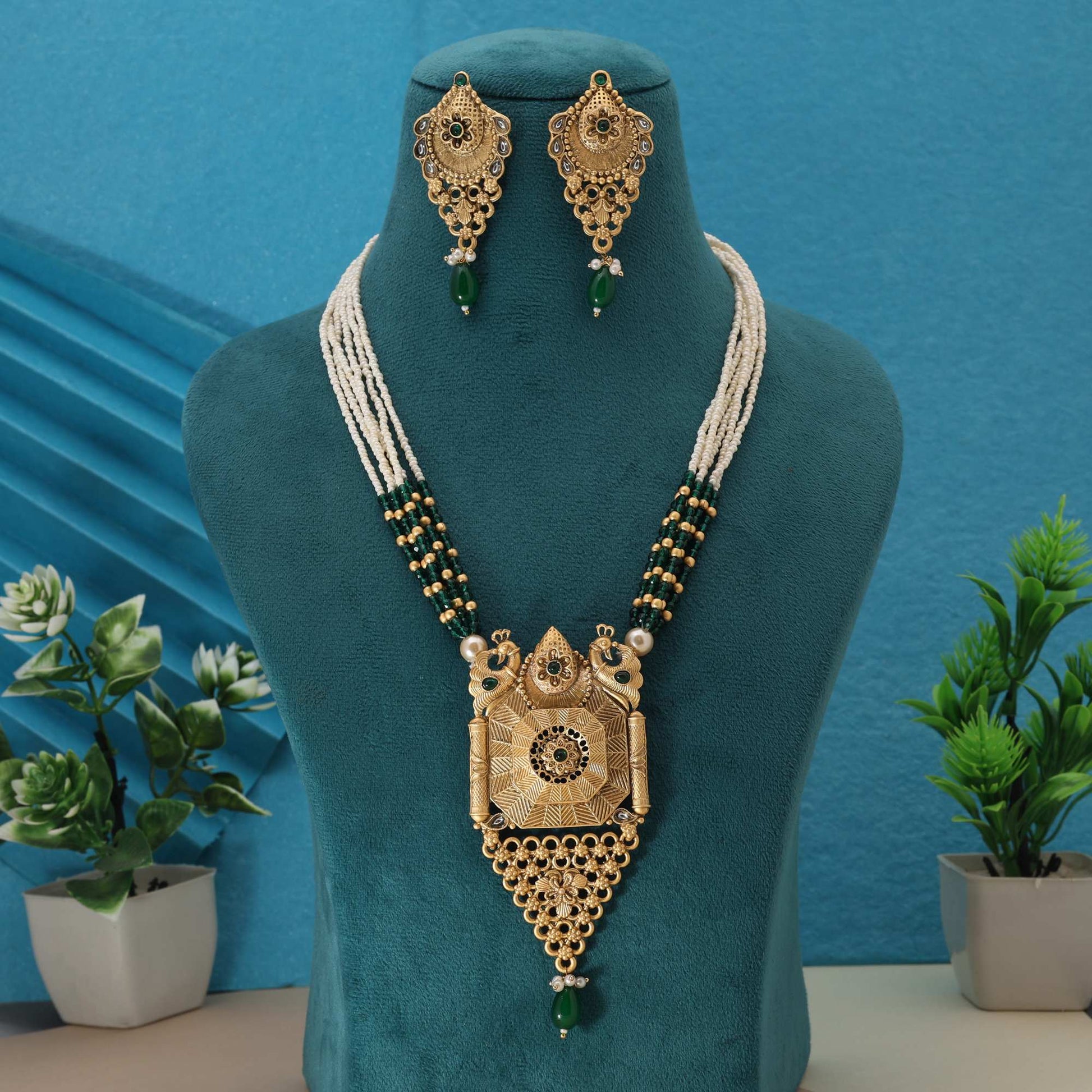Stylish Green Color Matte Gold Necklace Set With Handcrafted Meenakari Finish