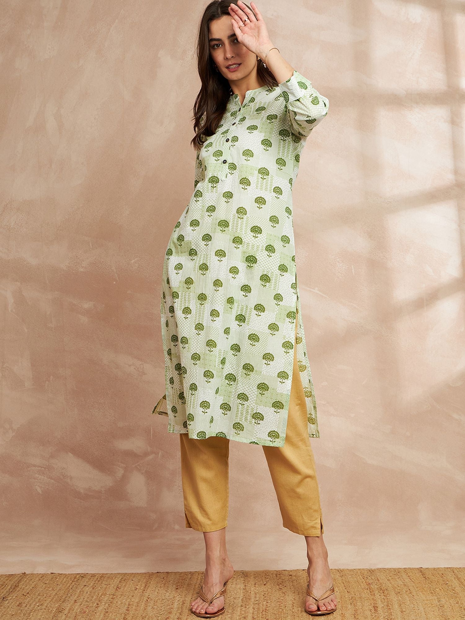 Green & White Color Floral Printed Straight Pure Cotton Kurta