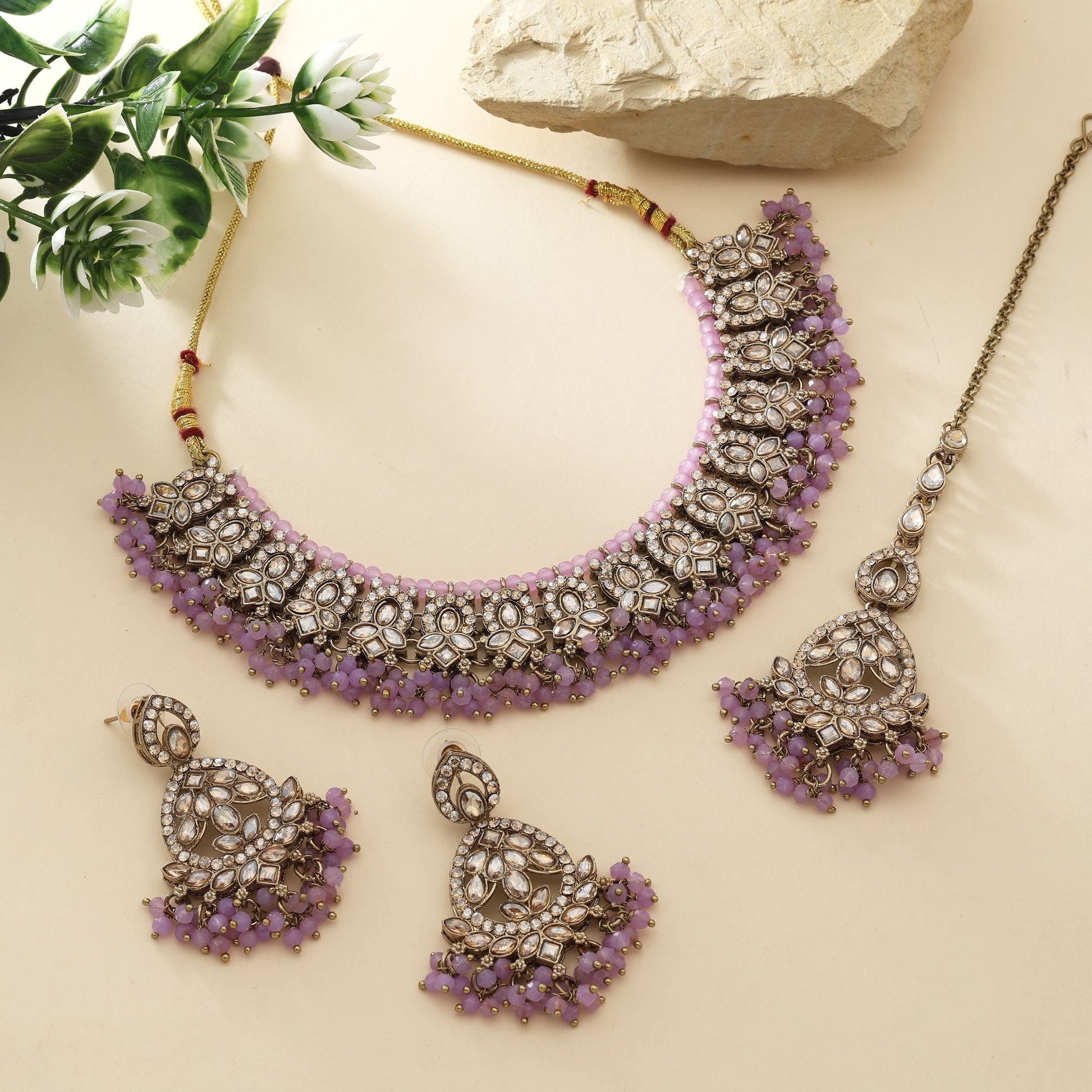 Beautiful Light Purple Color Kundan Necklace Set With Beads And Gold Finish