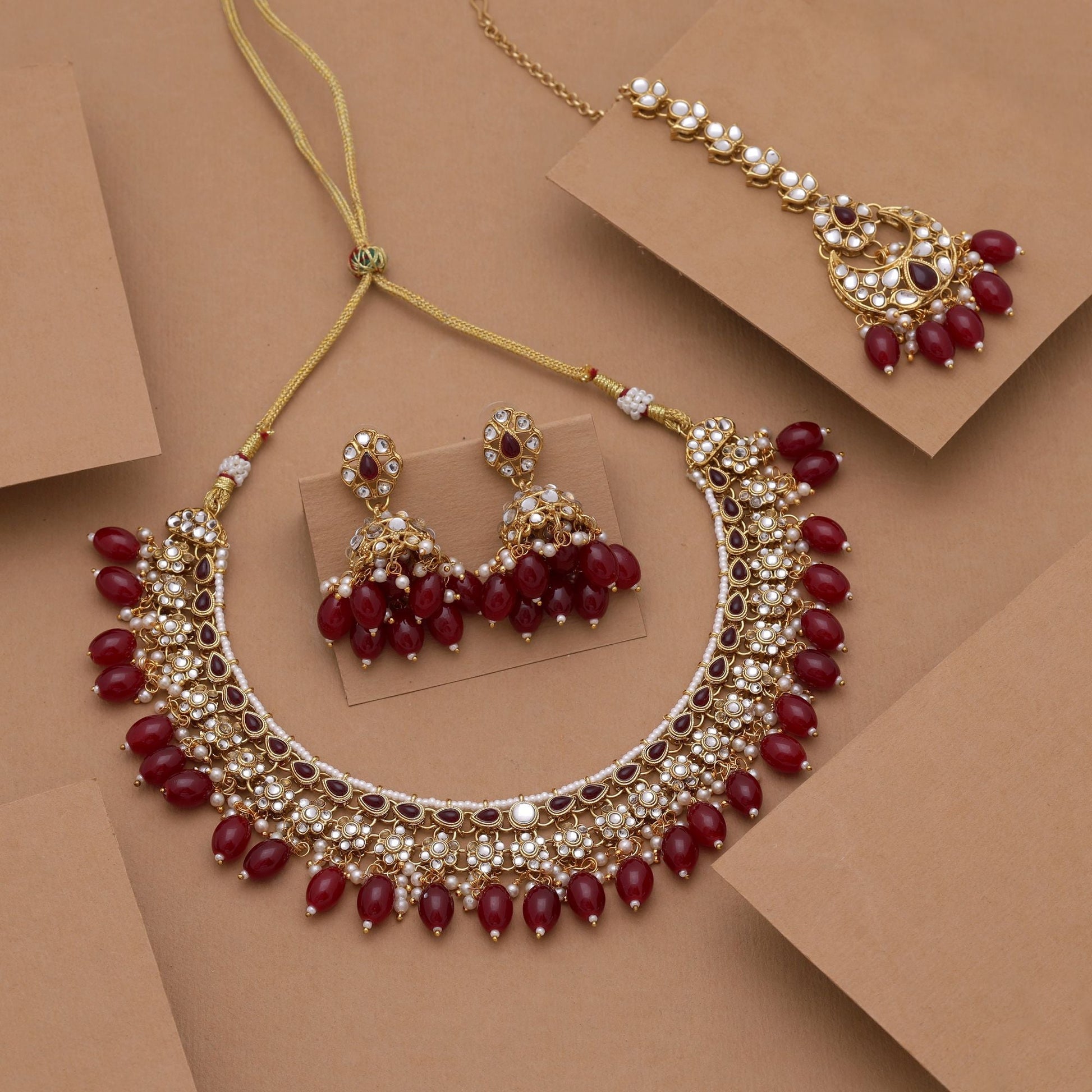 Bridal Maroon Color Kundan Necklace Set With Heavy Traditional Ethnic Jewellery