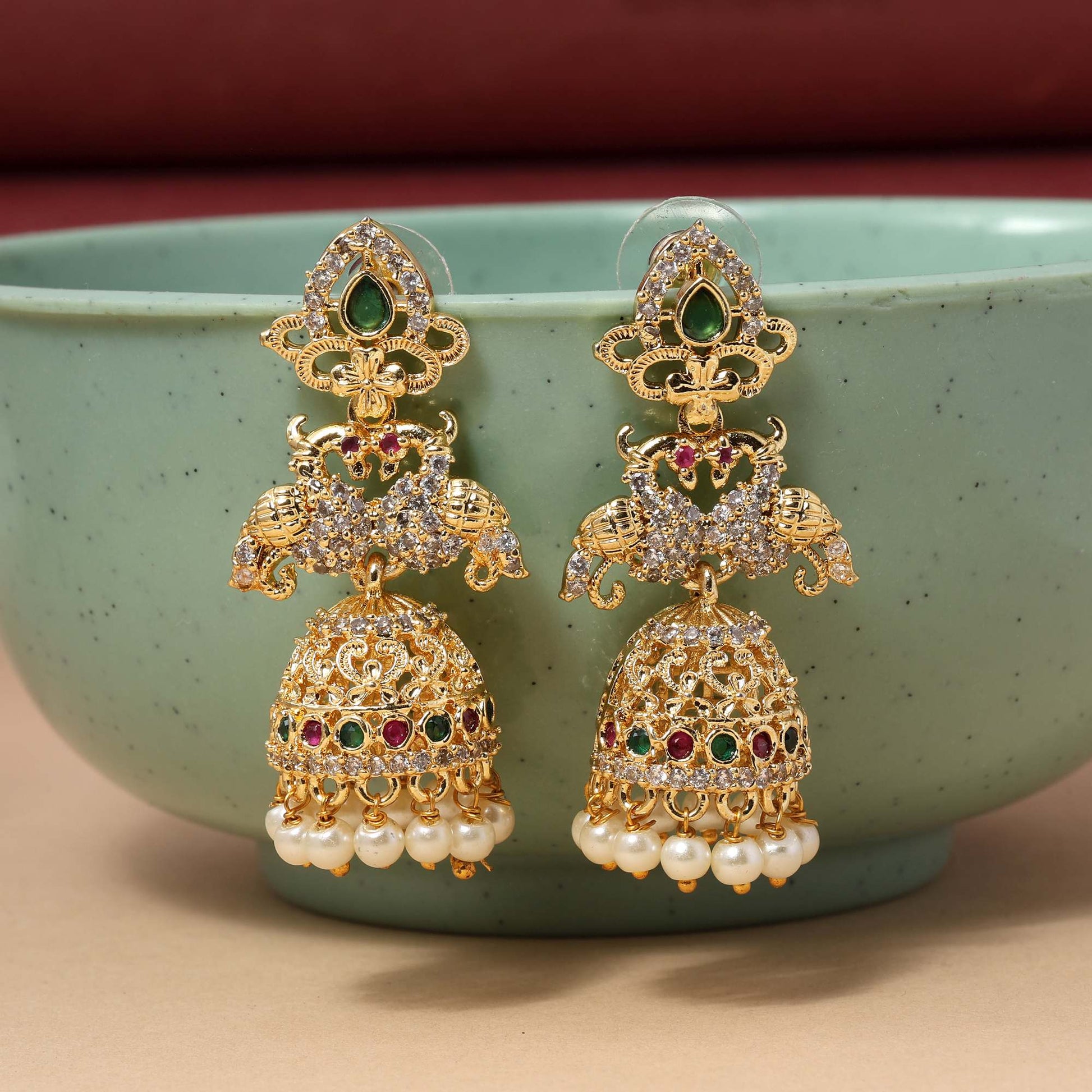 Maroon & Green Color Traditional American Diamond Earrings For Brides And Cultural Wear