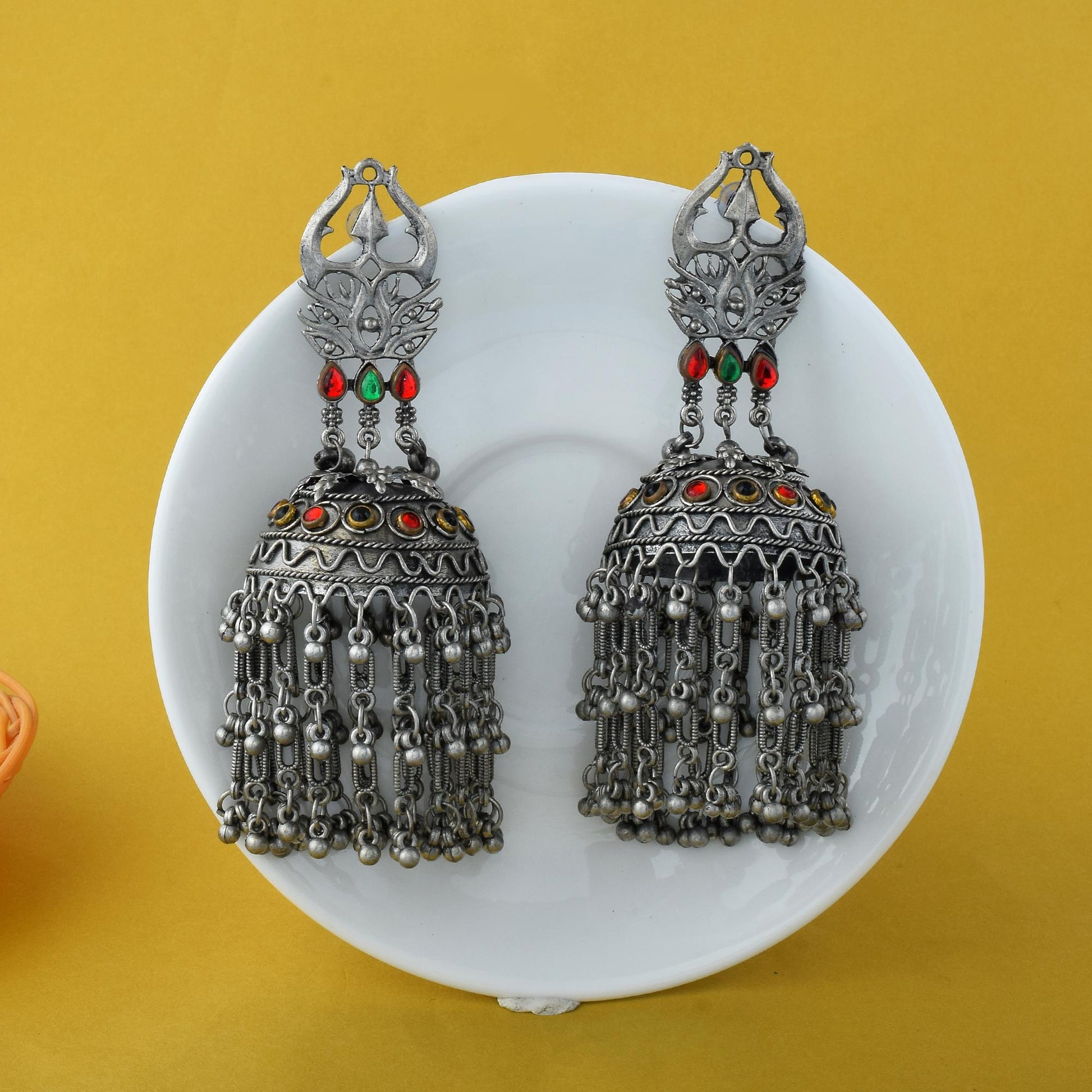 Eye-Catching Big Size Jhumka Silver Color Oxidised Earrings With Tribal Vibes