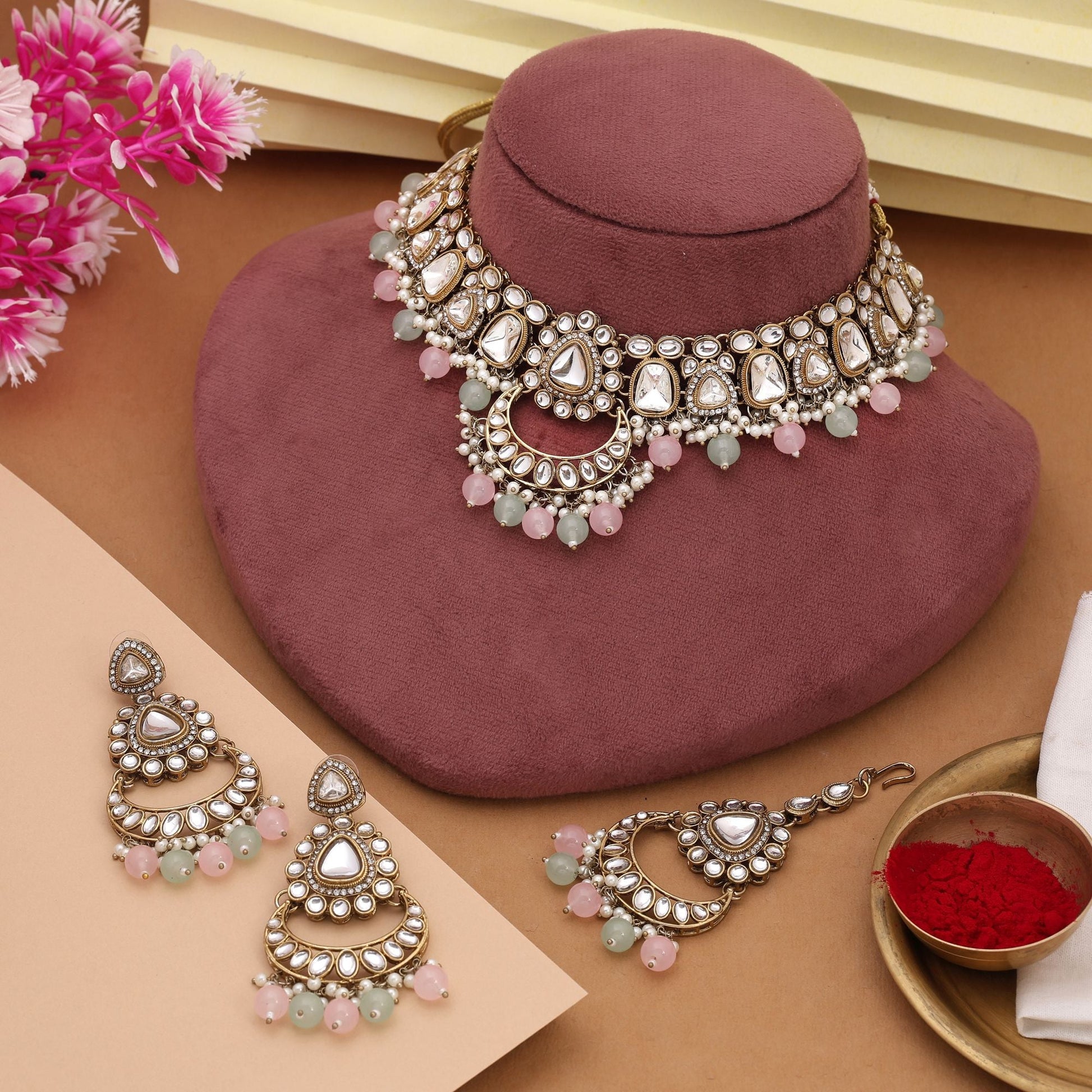 Trendy Pink & Pista Green Color Kundan Necklace Set With Dual Tone Stones