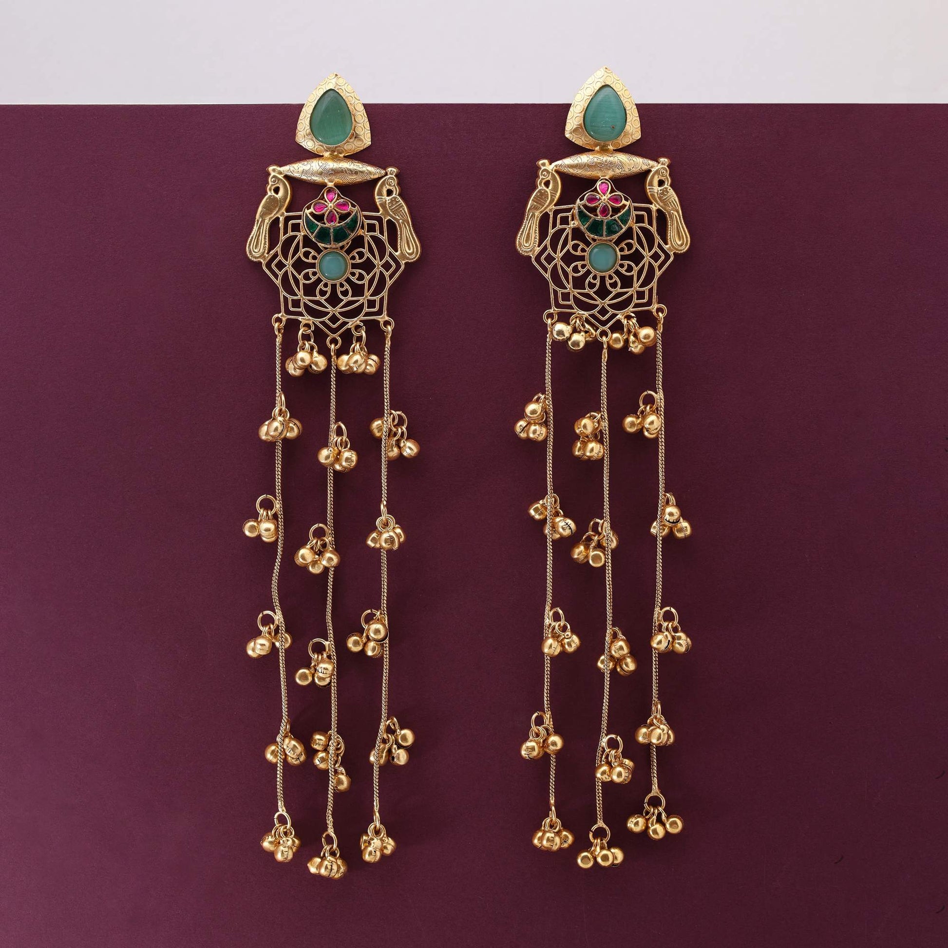 Pista Green Color Stylish Ethnic Long Kashmiri Earrings For Occasions And Parties