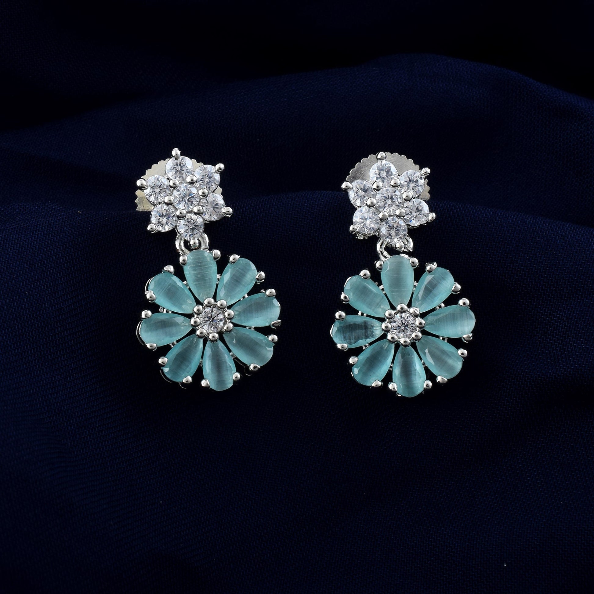 Rama Green Color American Diamond Earrings With Curved Leaf Drop Pattern