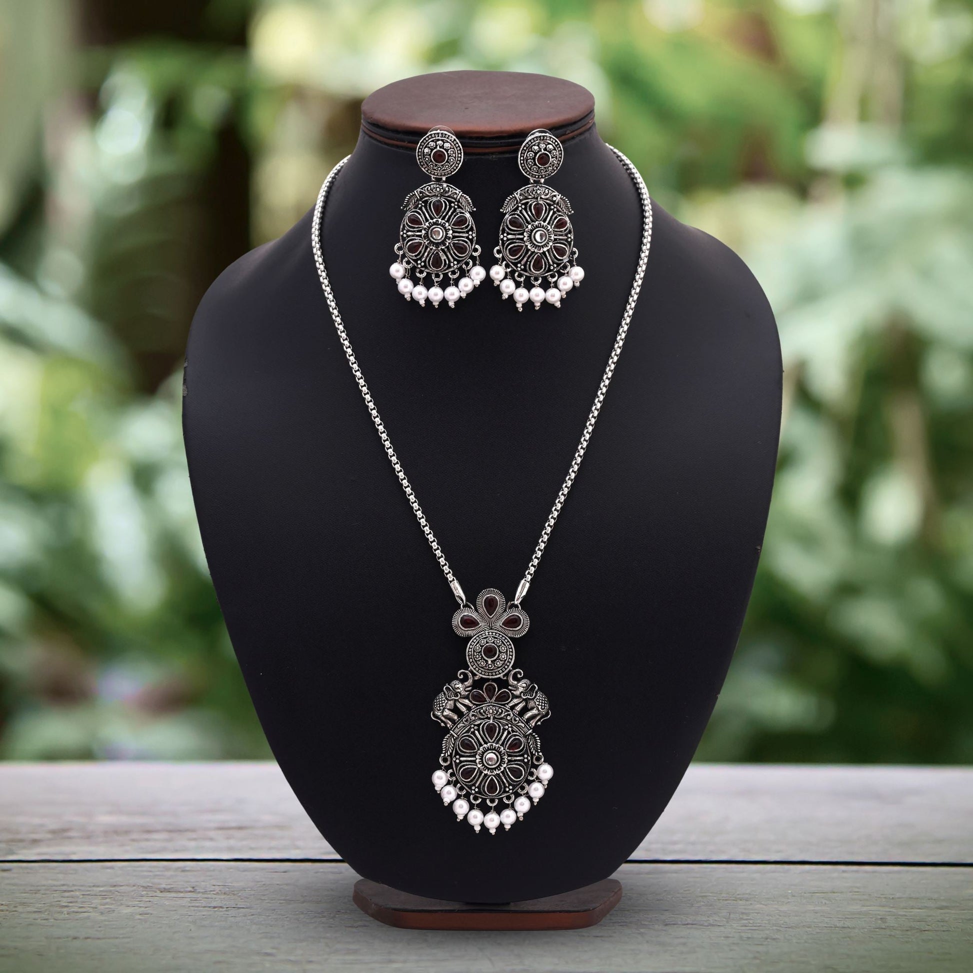Traditional Rani Color Oxidised Necklace Set With Antique Silver Finish