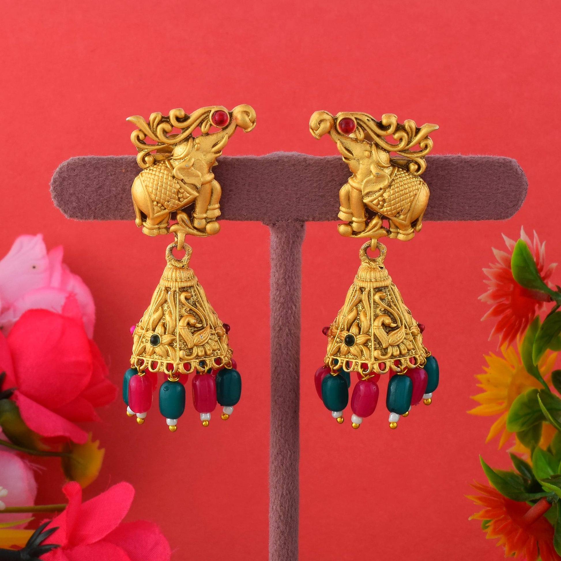 Royal Rani & Green Color Designer Matte Gold Earrings For Wedding Functions