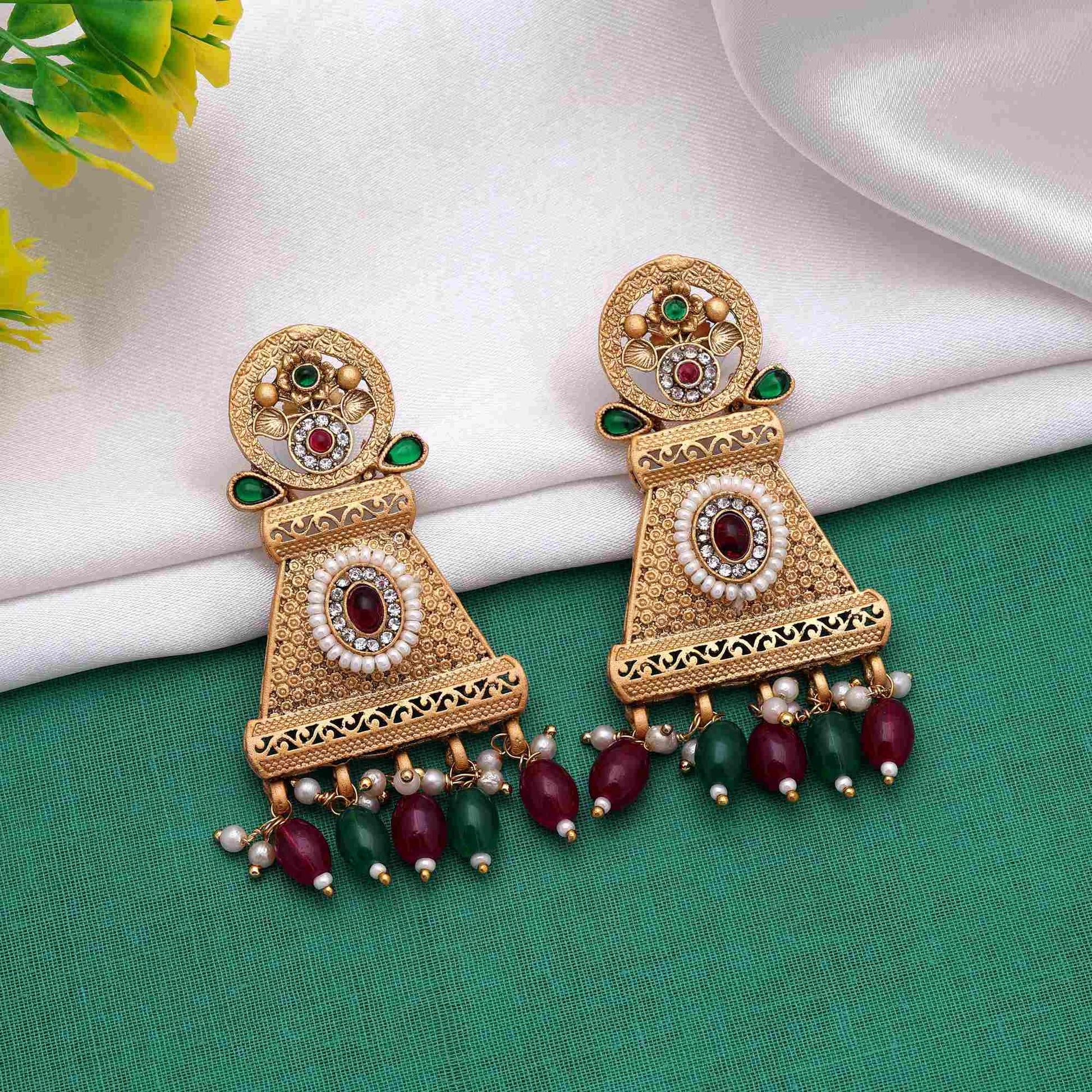 Royal Rani & Green Color Matte Gold Earrings For Wedding And Cultural Events