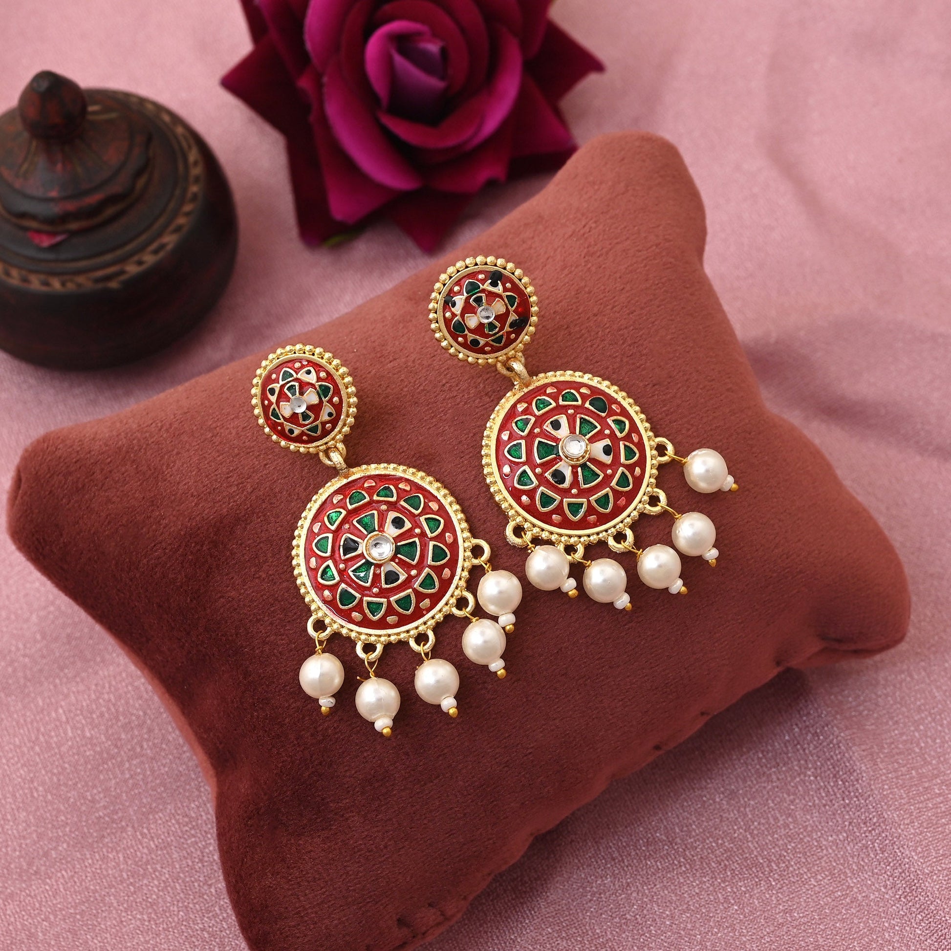 Exclusive Red Color Meenakari Earrings Designed For Traditional Cultural And Religious Festivals