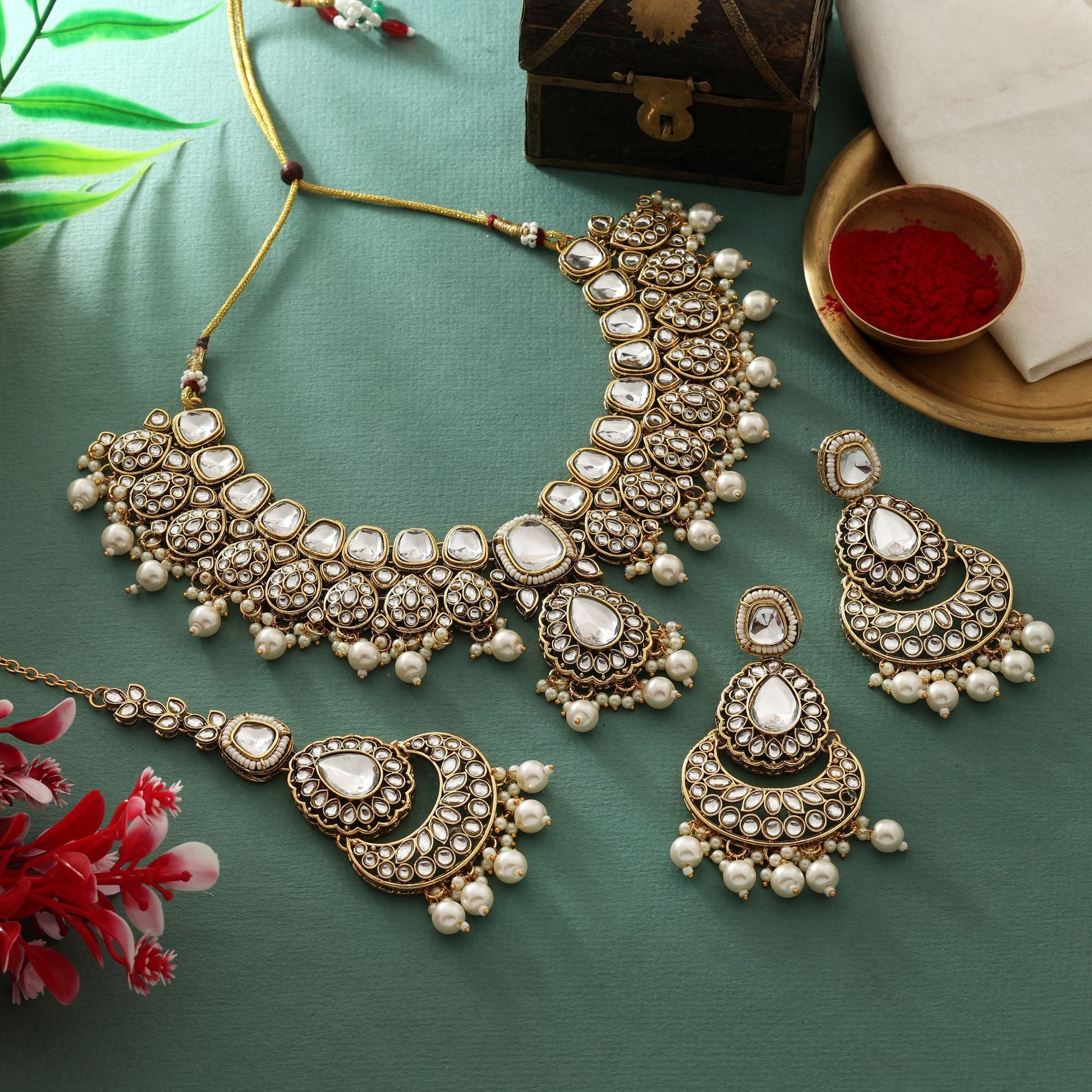 1 Piece Of Necklace::1 Pair Of Earrings::1 Piece Of Maang Tikka