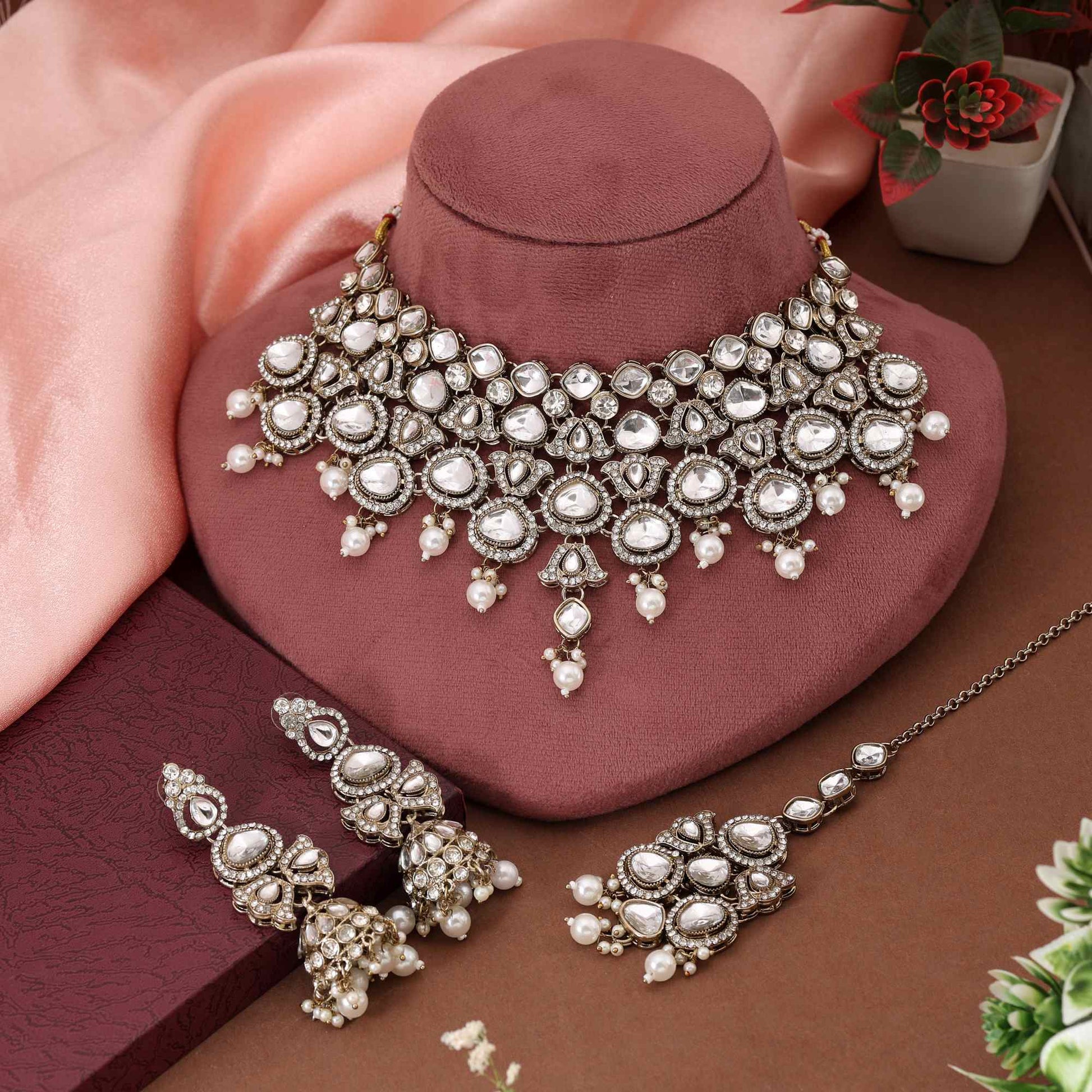 Pure White Color Kundan Necklace Set Ideal For Sophisticated Wedding And Festive Styling